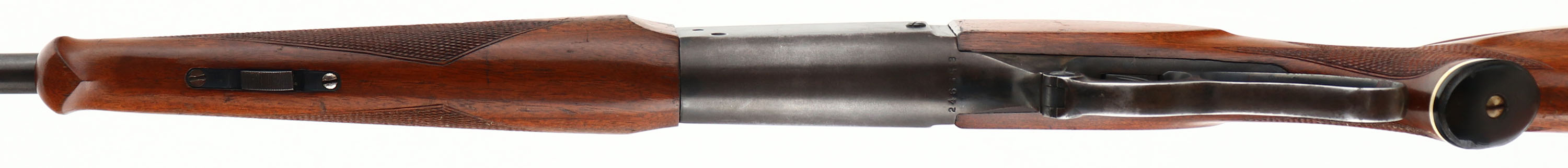 Savage, Model 1899 Take-down, marked 250-3000 Cal., MFG: 1923, SN: 246553, Lever Action Rifle, 22'' Tapered round barrel. The Bishop replacement checkered, cheeked & capped pistol grip Monte Carlo wood stocks are excellent & solid. The checkering on the wrist & beavertail forend appears original & are excellent, but there is a diamond at the wrist on both sides which appears to be added with a stippled background. There are numerous small scratches, scuffs & dings to what appears to be the original finish, which also shows some thinning & flaking. The metal blue finish on the barrel & receiver rates 50%, with spotty areas of loss or wear that is toning to a thin brown patina. The case-hardened lever displays the remains of muted case-coloring. Barrel fitted with a Marbles full buckhorn adjustable rear & original blade front sights. Bore is very good, but with some haze & roughness amongst solid rifling. The stock carries a white line serrated plastic buttplate, which matches the cap on the pistol grip. Action remains solid & tight. Great overall appearance. FFL or C&R Req. - Value: 600 to 1200