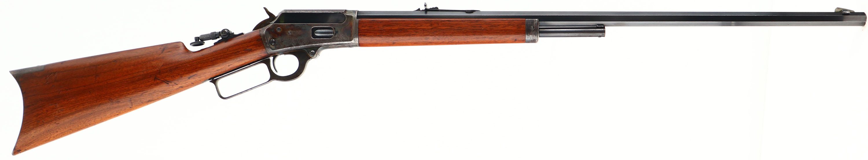Marlin, Model 1894, marked .25-20 M Cal., MFG. 1900, SN: 197903, Lever Action Rifle, 26'' Octagon barrel rather than the standard 24''. Half mag. The original straight grip wood stocks are excellent, with several minor scratches, scrapes & contusions to the original factory finish. The original metal blue finish is 95% on the barrel & 60% on mag tube. The case-hardened receiver, lever, hammer & buttplate all display strong to faded case-colors. Bore is very good & bright. Rifle fitted with a Marbles flip-up tang sight with lard aperture disk, standard adjustable rear & Sheards long blade front sight. Crescent metal buttplate. Strong eye appeal on this all original & overall excellent 1894 rifle. FFL or C&R Req. - Value: 2500 to 4000