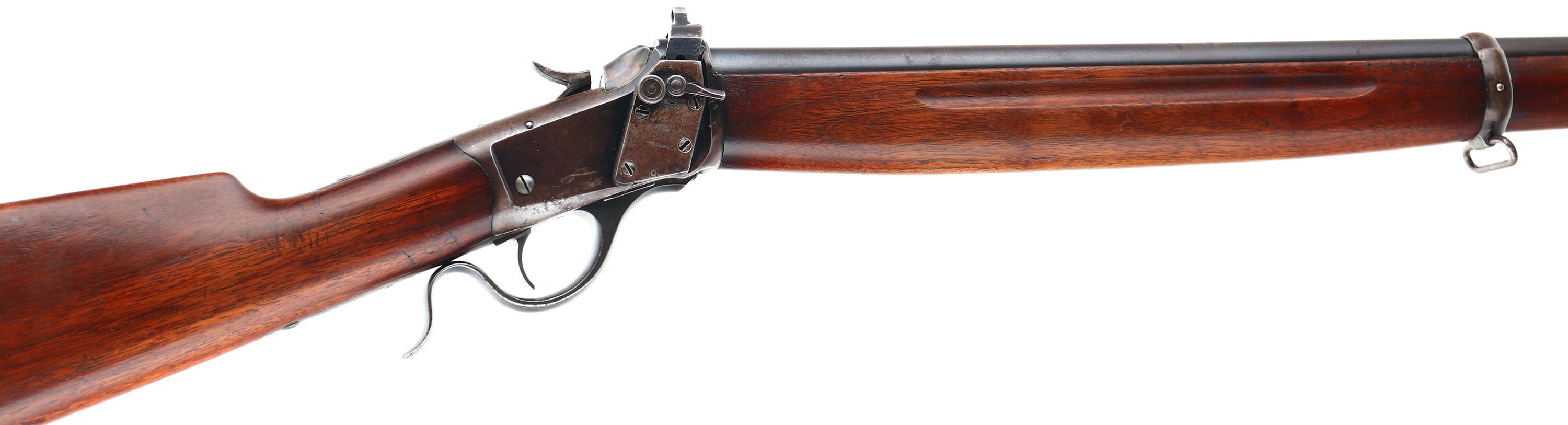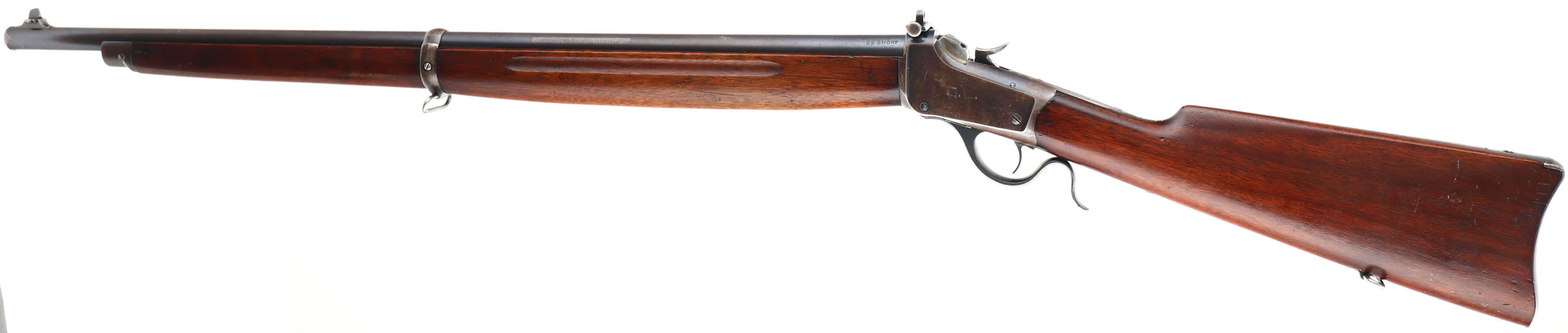 Winchester Model 87 Winder Musket, CAL: marked 22 SHORT, MFG: 1919, SN: 133563, Lever Action Falling Block Single Shot Rifle, 28'' Round barrel. This is the third variation of the Winder musket built on the low wall frames of the 1885 rifles. The third variation was introduced in January 1918 & ended just two years later in June of 1920 with total production estimated at 13,000. This example is ''U.S.'' & Firebomb stamped behind the hammer & ahead of the upper tang. The original single barrel banded stocks are very good & solid, with most of the original finish remaining. There are numerous minor surface scratches, small contusions & scrapes. There is also 3 initials lightly scratched into the stock just above the lower tang on the right side of the wrist. The metal blue finish has thinned on the barrel to about 50%. The receiver finish has worn to a thin brown patina, with remains of original blue in more protected areas. The initials ''O.L.'' are scratched into the left side of the receiver. Bore is good, with some roughness amongst thinning rifling. The receiver holds a Lyman No. 53 adjustable windage/elevation peep sight, while the barrel carries a small blade front sight. Buttstock carries a smooth metal carbine style buttplate. Factory sling swivels. A nice example. FFL or C&R Req - Value: 500 to 1000