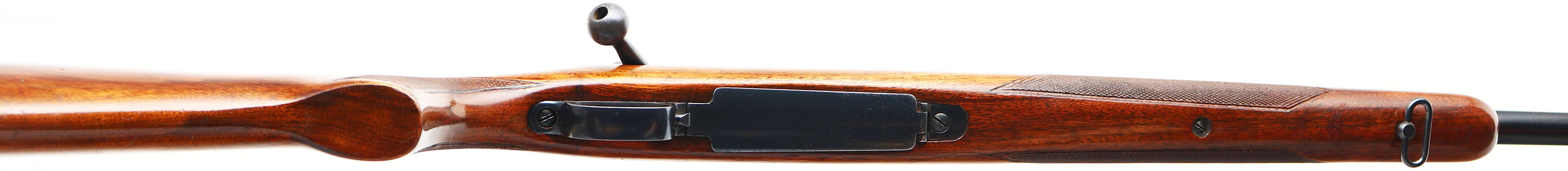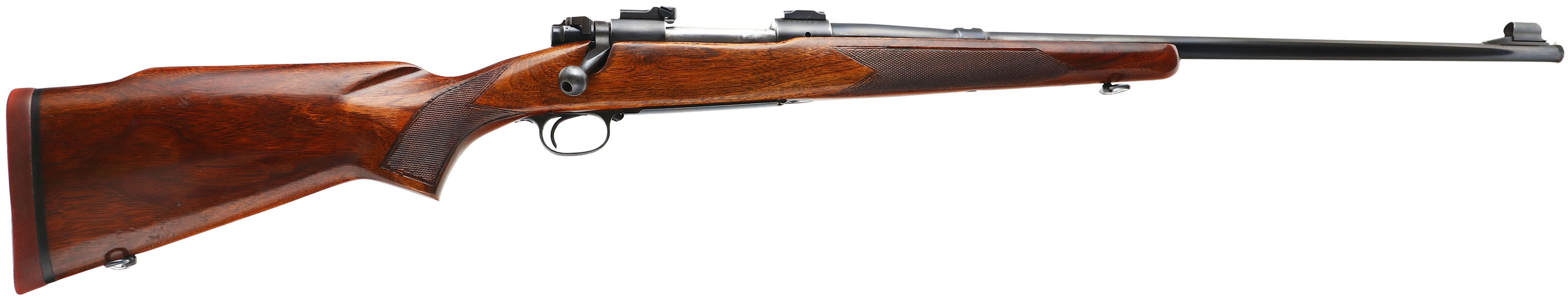 Winchester, Model 70, CAL: 338 WIN MAGNUM, MFG: 1961, SN: 520090, Bolt Action Rifle, 25'' barrel. Desired pre-64. The original, checkered & flat pistol grip Monte Carlo stock is very good. An attempt to retrace the checkering was done long ago & the stocks received an added thin layer of finish over the remaining original finish. There are numerous light handling marks, scratches & contusions, with some thinning & haze to the finish. The original metal blue finishes rate 95% overall. Bore is very good. The receiver carries scope blocks, while the barrel has an open rear dovetail & a hooded front ramp sight. Stock carries a Winchester solid recoil pad. Factory sling loop. The 338 Win Mag caliber is one of the more desirable calibers amongst collectors & premiums are typically paid for examples which still present well like this example. FFL or C&R Req. - Value: 1000 to 2000
