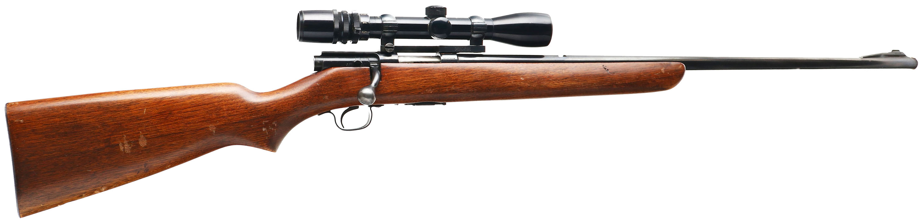 Winchester Model 43, CAL: 22 Hornet, Standard First Variation, MFG: 1950, SN:35438A, Bolt Action Rifle, 24'' round barrel. The flat pistol grip wood stock is very good & solid, but with lots of small nicks, scrapes, scratches & contusions to the original finish. The factory metal blue is 90% on the barrel & receiver. Bore is excellent. The rifle is fitted with Bushnell Scopechief IV 2.5x-8x scope, while the barrel has an open rear dovetail & ramp style front sight. Stock missing both sling swivels. Checkered metal buttplate. Original factory detachable mag. A fairly rare rifle as Winchester only made it for six years, with just over 62,500 produced. FFL or C&R Req. - Value: 600 to 1000