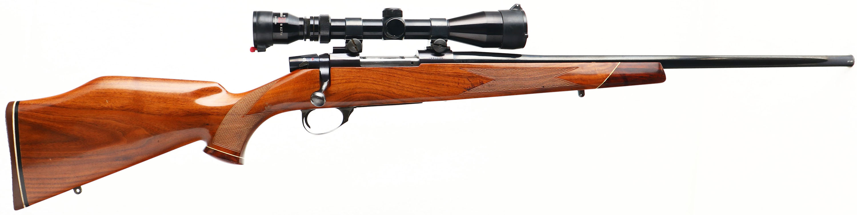 Weatherby, Vanguard, CAL: .243, MFG: 1970-84, SN: V03236, Bolt Action Rifle, 24'' barrel, including the ported muzzle break. This is a Weatherby Vanguard South Gate California receiver, the original Japanese made barrel & the original stock. The original cheeked, checkered & capped pistol grip wood stock is excellent. It features the white liner contrasting rose wood forend tip & grip cap with diamond inlay. There are a number of small scuffs, dings & contusions to the original high gloss finish. The metal blue finish rates 95% overall, with the finish on the receiver toning plum. The finish on the floorplate & trigger guard has toned greenish brown. Bore is excellent. The receiver carries a Tasco 3-9x40 scope, with flip-up caps, & no open sight provisions. Sling studs. Stock carries the original white & black spacer Weatherby solid recoil pad. A quality & original vintage Weatherby. FFL Req. - Value: 700 to 1200