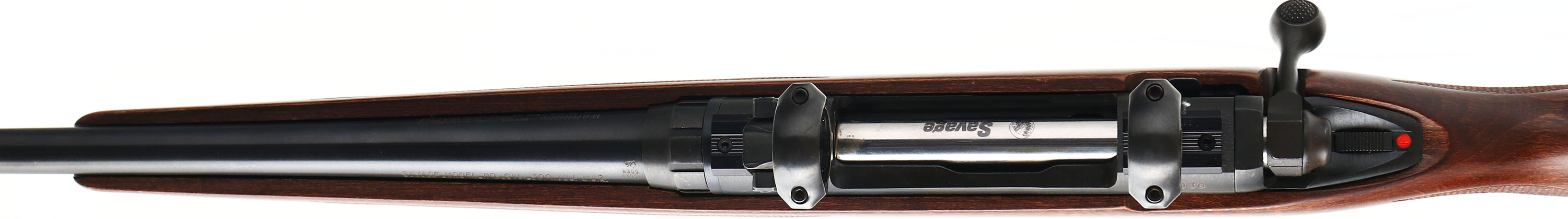 Savage, Model 110, CAL: 300 WIN Mag, MFG: Modern, SN: F874036, Bolt Action Rifle, 24'' Tapered barrel. The original checkered & flat pistol grip Monte Carlo wood stock is nearly new, with only a couple of tiny contusions. The original metal black finish rates 99%. Bore is excellent. The receiver holds two scope mounting blocks & rings, with no open sight provisions on the barrel. Stock carries a solid recoil pad. Sling studs. An almost new condition modern hunting rifle. FFL Req. - Value: 500 to 800
