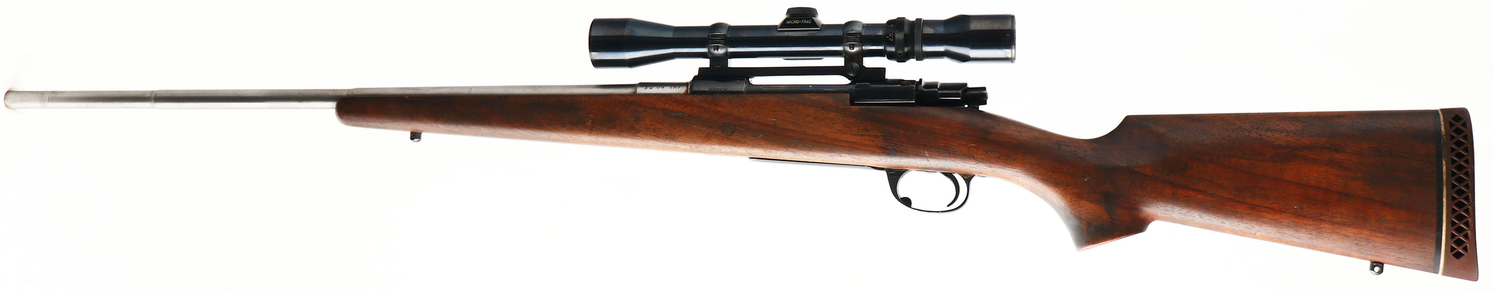 CUSTOM Interarms (Mauser Action) Model Mark X Custom Sporting Rifle, CAL: 30-06 Ackley Improved, MFG: Modern, SN: A227568, Bolt Action Rifle, 24'' Stepdown barrel. The .30-06 Ackley Improved is a wildcat cartridge formed by firing a .30-06 Springfield cartridge in a rifle that has been chambered or re-chambered for the ''improved'' version. Upon firing, the case ''blows out'' to conform to the new, enlarged chamber. The new dimension has a reduced body taper & increased shoulder angle compared to the original .30-06 Springfield case. By doing so, the volume is increased a small amount, less than five percent. You cannot get the fatter case of a .30-06 Ackley Improved into a standard .30-06 Springfield rifle chamber, but the reverse is obviously true. The flat pistol grip walnut stock on this rifle is very good & solid. There are several small handling blemishes & some chipping behind the upper tang, to the flat finished hand oiled stock. The stock has some soiling & darker staining. The barrel is left in the white (not blued), while the metal blue finish on the receiver, floor plate & trigger guard rates 80% overall. Bore is excellent & bright. The receiver carries a Weaver Micro-Trac V7-II W USA 2.5x7 scope, with no open sights on barrel. Buttstock carries a ventilated recoil pad. Sling studs. A solid custom built sporting rifle in a unique caliber. FFL Req. - Value: 300 to 600