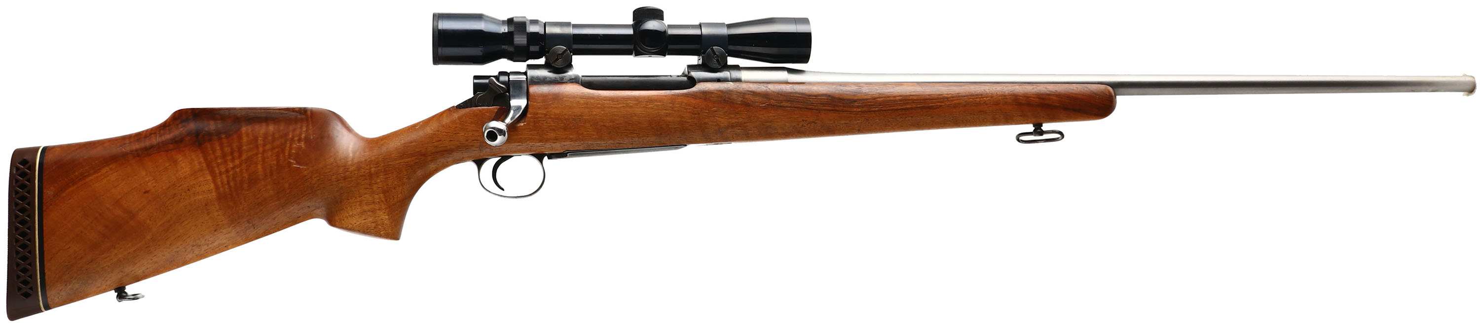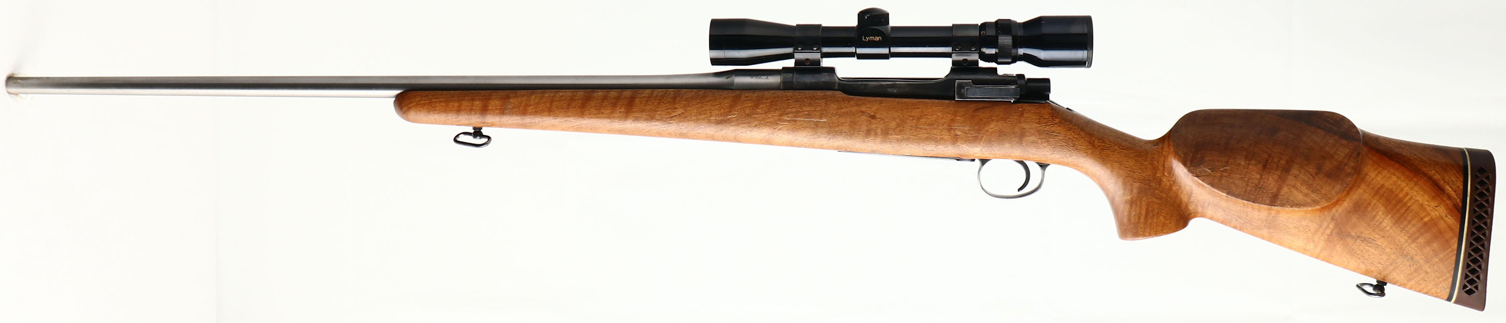 CUSTOM Eddystone, Model 1917 Enfield Custom Sporting Rifle, CAL: .270/.284 according to tag from consigner, MFG: 1918, SN: 1278863, Bolt Action Rifle, 26'' tapered barrel. The sporting Monte Carlo stock is excellent, with rollover-cheek & a flat pistol grip. The walnut stock exhibits very nice rippled grain, with minor scratches or contusions to the finish. The custom barrel is marked W.H. Hoboughon the left side of the barrel. Bill Hobaugh was well known as a quality barrel maker that practiced his trade for many years out of Phillipsburg, Montana. It was said that he was one of the few who would tackle custom octagon barrels & many custom rifle makers utilized his barrels & tubes. The barrel caliber is not marked on rifle. The un-blued (in white) barrel exterior is excellent. The receiver, floorplate & trigger guard retain remnants of the original finish. Bore is very good. The receiver carries a Lyman 2x-7x scope on Weaver detachable rings, with no open sights on barrel. Buttstock carries a Pachmayr ventilated recoil pad & sling loops. A nicely built custom sporting Enfield. FFL or C&R Req. - Value: 300 to 600
