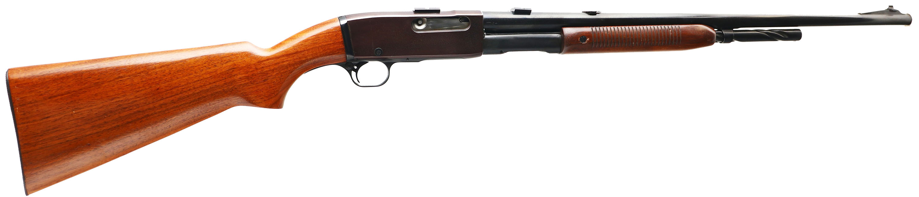 Remington, Model 141 Gamemaster, .30 REM Cal., MFG. 1938, SN: 16682, Pump Auction Rifle, 24'' round barrel, The original flat pistol grip wood stocks are excellent & solid, with the stock having been very nicely refinished, forend finish original. Stocks show very few light handling marks. The metal blue has been refinished, rating 95% on the barrel, with some speckling, while the receiver finish has toned plum with a spotty haze. Bore is excellent. Mounted with two scope blocks on the receiver & barrel, with an extra screw filled hole behind the block on the barrel. The rear dovetail filled with a blank & standard front ramp sight. Checkered metal buttplate. Action is tight & functions well. FFL or C&R Req. - Value: 300 to 600