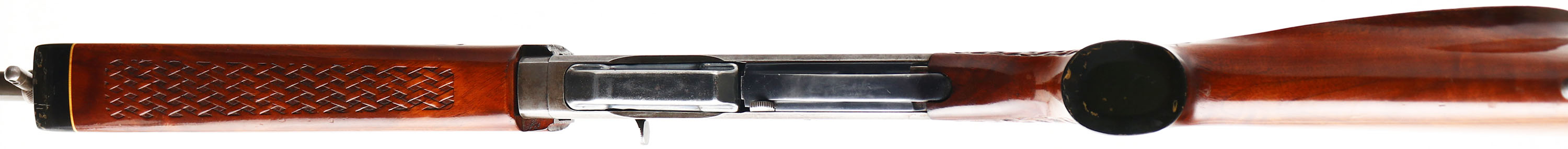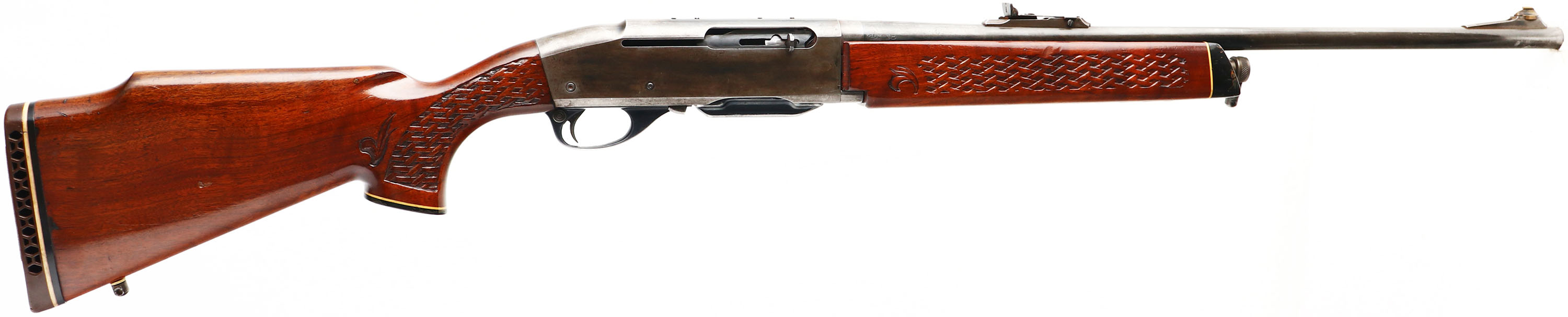 Remington, Model 742 Woodsmaster, 30-06 SPRG. Cal., MFG. 1972, SN: 7226365, Semi-Auto Rifle, 22'' round barrel, The factory basket weave checkered & capped pistol grip wood stocks are very good, solid & original. They carry several minor scuffs, handling marks & contusions to the factory finish. The factory metal blue finish has worn off to mostly a gun metal gray, with a thin layer of brown patina & some remains of original blue. Ramp adjusting rear sight & ramped brass blade front sight. Receiver has been factory tapped for potential scope mounting, a scope was previously mounted. Bore is excellent. Stock carries a White Line ventilated kickpad. 13 1/4'' LOP over pad. Sling swivel provisions. A popular caliber semi-auto hunting rifle. FFL or C&R Req. - Value: 250 to 450