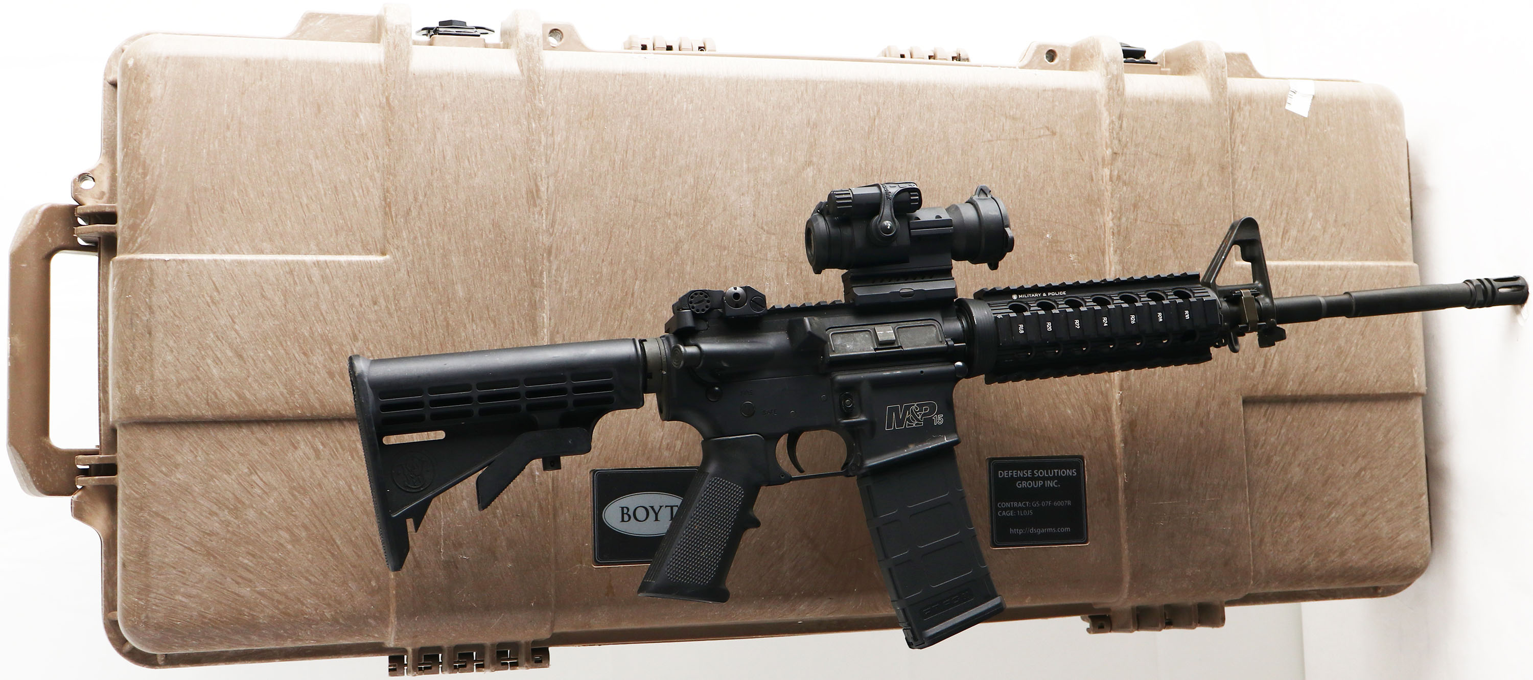 Smith & Wesson, M&P 15, CAL: 5.56, MFG: Modern, SN: SP39254, Semi Auto Rifle, 16'' barrel or 17 1/2'' w/muzzle brake. The checkered plastic grip & 6pt adjustable stock are excellent. There are handling marks & surface scrapes. The matte black finish rates 90% overall. Bore is excellent. Factory flip-up rear sight & tall post front sight. Quad picatinny forend for accessories. The rifle is also fitted with a red-dot Aimpoint Patrol Rifle Optic. Stock has checkered plastic buttplate. Magpul P-MAG 30rnd. Comes with a tan BOYT hard case, with (2) 12rnd mags & sling. FFL Req. - Value: 400 to 800