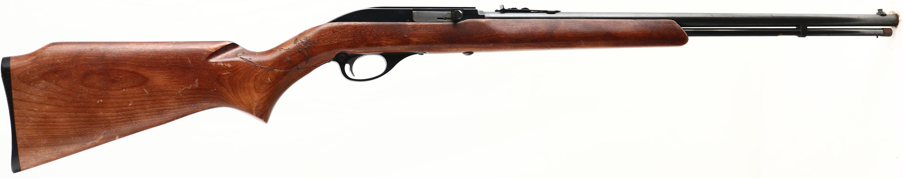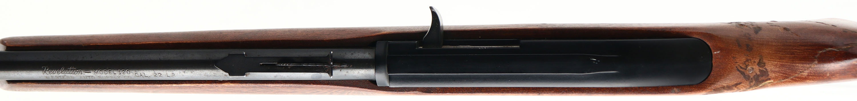 Western Auto Supply Co. Revelation (Marlin Glenfield 99), Model 120, CAL: 22 LR, MFG: 1960's, SN: none, Semi Auto Rifle, 22'' barrel. Full 17 rd mag. The original flat pistol grip Monte Carlo stock is poor, as a result of a full break & poorly glued repair at the wrist of the pistol grip. It also has 7 added pegs in the area of repair to add structure. Despite the break & gap at the repair, the stock is fairly solid, with lots of other finish level scratches & scrapes to the original finish. The original metal blue finishes rate 80%. Bore is excellent. The barrel holds a standard adjustable rear sight & small blade front sight. Stock carries a checkered plastic buttplate. FFL or C&R Req. - Value: 50 to 150