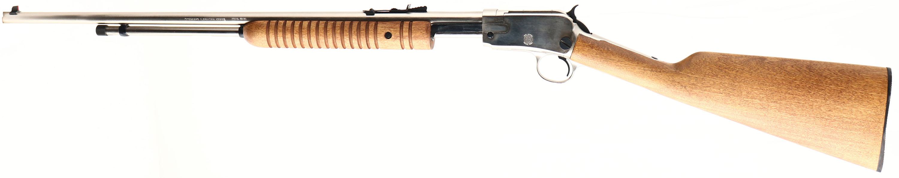 BOXED Rossi Model 37, marked .22 S.L. LR., MFG: 1980's, SN: G382012, Pump Action Rifle, 23'' round barrel. This is a Rossi reproduction or copy of the Winchester 62. The original blond straight grip wood stocks are excellent & carry the original excellent finish, with no wear. The original matte stainless finish on the barrel & tube, & polished stainless on receiver all rate 100%. Bore is new. Barrel has factory sights. Buttplate is original. Comes in the correct factory box, with owner's manual & packaging. An excellent, original & fairly rare little pump rifle. FFL Req. - Value: 300 to 500