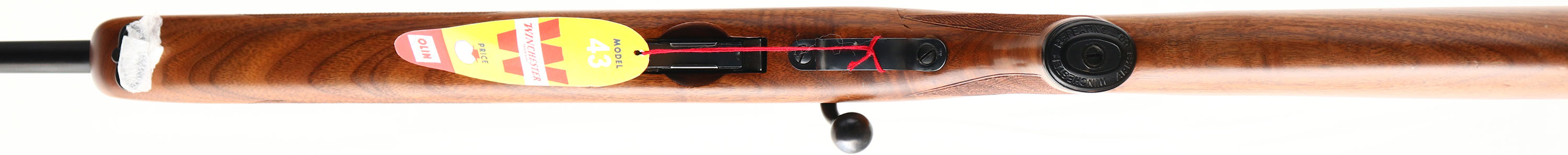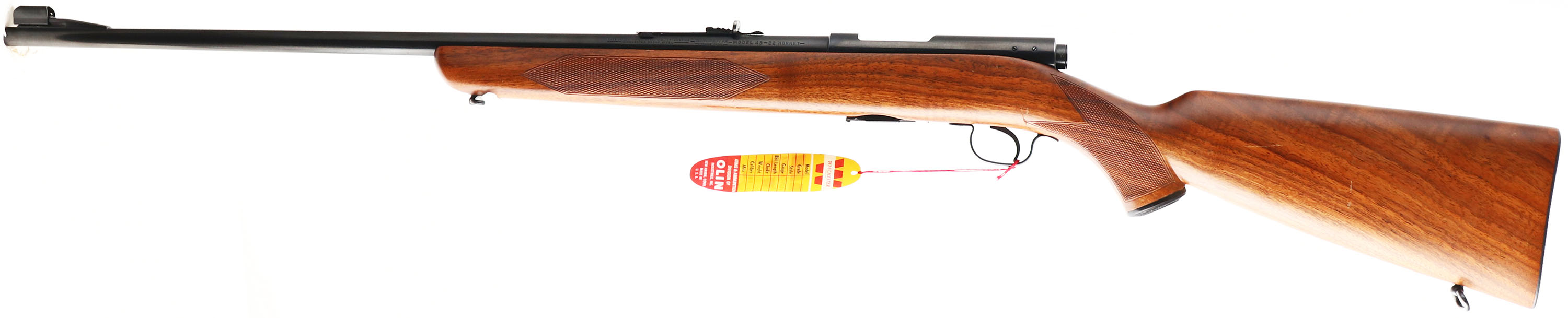 RARE Winchester, Model 43 ''Special Model'', CAL: 22 Hornet, MFG: 1950, SN: 28595A, Bolt Action Rifle, 24 1/2'' barrel. The original deluxe checkered & capped pistol grip wood stock is excellent, with a couple of minor handling marks & dings. Excellent original finish. The factory metal blue finish rates 99% overall. Bore is excellent, with sharp rifling. The barrel holds an adjustable rear sight & ramped hooded front sight. Buttstock carries a checkered metal buttplate. Factory sling loops. Comes with the factory mag marked ''MODEL 43 22 HORNET'' & a repro hang tag. During the 5 years of production, 1948 to 53, less than 63,000 model 43 rifles were produced. Of those, very few were deluxe ''Special Models''. Collector's typically add 100% to value for the deluxe ''Special Models''. A high condition deluxe rifle that's very collectible & desirable.* FFL or C&R Req. - Value: 4000 to 5500