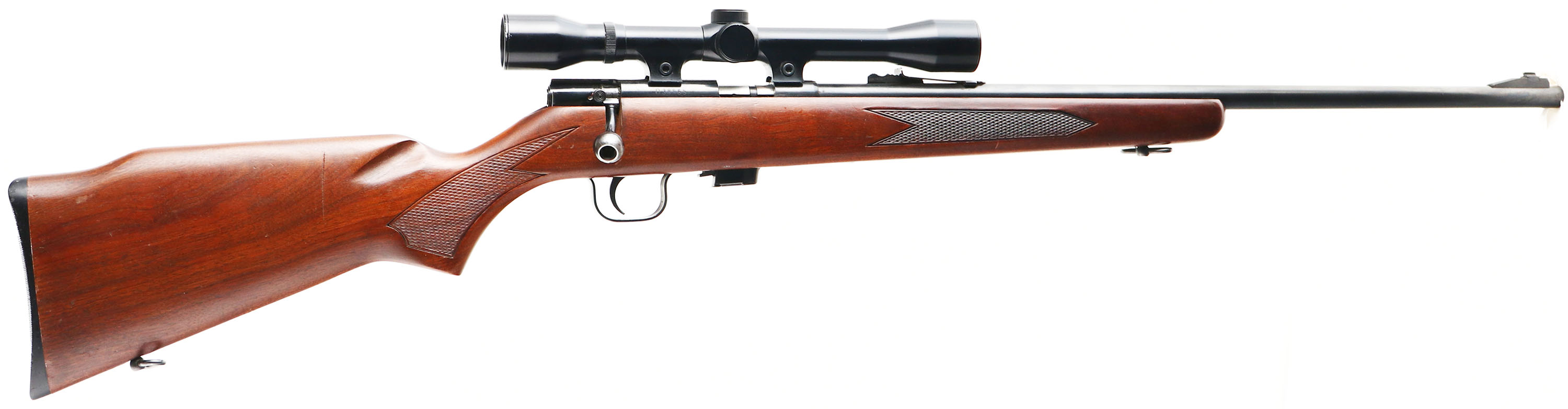Winchester, Model 320, CAL: 22 S,L,LR, MFG: 1972-74, SN: 38565, Bolt Action Rifle, 22'' barrel. The checkered flat pistol grip wood stock is excellent, with multiple light surface scrapes & contusions. The metal blue finish rates 98% overall. Bore is excellent & bright. The grooved receiver holds a Weatherby Mark XXII 4X50 scope, while the barrel carries factory sights. Buttstock carries a Winchester grooved black plastic buttplate. Detachable magazine. Sling swivels. FFL or C&R Req. - Value: 300 to 500