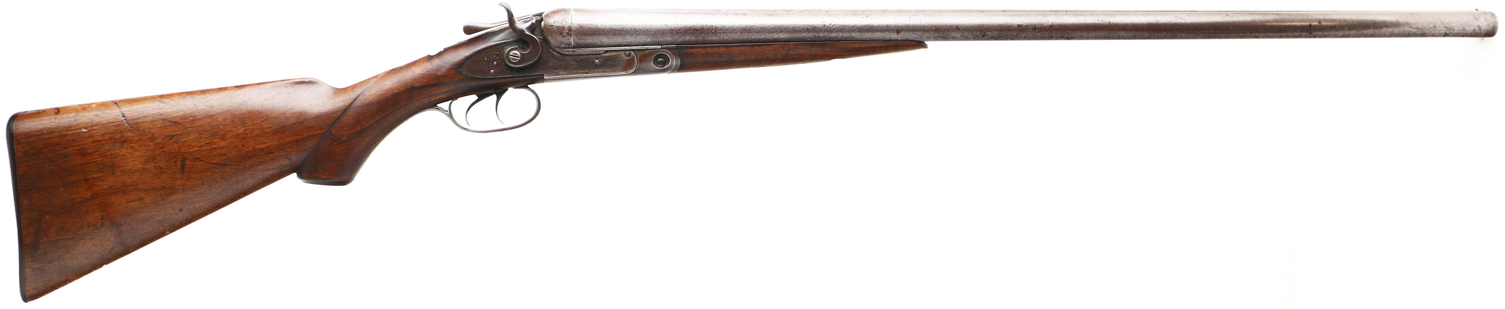 Parker Bros, D2 Grade, CAL: 10 GA, MFG: 1884-85, Antique, SN: 40141, Break Action SxS Shotgun, 30'' Damascus barrels. The solid rib is marked ''PARKER BRO MAKERS. MERIDIAN CONN. DAMASCUS STEEL''. The right flat of the floor plate is marked with a two line patent date & the left flat is marked ''2'' over the full SN & patent date. The left barrel flat is marked with a two line patent date & the full matching SN can be found on the forend, which still retains case-colors. ''PARKER BROS'' can be seen on the top of both lock plates. The American walnut checkered, capped pistol grip stocks are very good & solid. The checkering is smooth, alongside dings, scratches & scrapes. The stock has been lightly sanded, with protective oils added over time. There is a blank silver shield initial plate behind the tang The thumbprint Damascus finish on the barrels is still prominent, worn to a mix of metal gray & brown patina. The receiver, trigger guard, break lever, hammers & side plates have all fully toned to a brown patina. The left sidelock displays quail game scene & the right has a flying duck game scene. There a circle vignette with an engraving that's been worn smooth. The game scenes are accompanied by ornamental scroll on the receiver, side plates, break lever, hammers, trigger guard & forend metal components. Bores are good, consistently rough with light pitting. Solid rib holds a single front bead. Stock has a worn Parker hard rubber dogs head buttplate. Antique, No FFL Req. - Value: 1000 to 2000