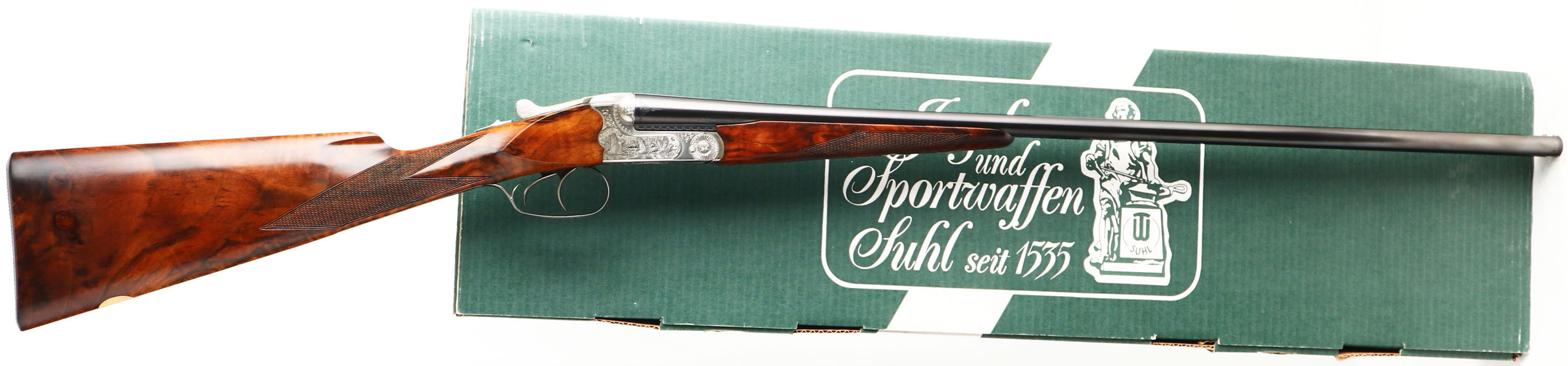 FABULOUS & BOXED, Merkel, Model 280 EL ( DF Model 41E), CAL: 28 GA, MFG: 1975, SN: 387100, Break Action SxS Shotgun, 28'' barrels. The left barrel is marked in three lines ''MERKEL USA INC TRUSSVILLE, AL.'', ''GEBR. MERKEL SUHL'', ''MADE IN GERMANY''. The right barrel is marked ''280 EL'' & ''28 GA''. The bottom of the receiver is marked in gold lettering ''MERKEL CUSTOM'', & ''28 BORE'', over the Suhl trademark logo. The top of the break lever is marked ''EL'', also in gold lettering. ''FP'' engraver initials on lower left corner of receiver. The original checkered straight grip wood stock is excellent. The grain pattern & wood figure is noteworthy & attractive. There is a blank gold oval nameplate on the belly. The metal blue finish on the barrels rates 99% overall. The polished coin silver receiver, trigger guard & break lever are all excellent. The receiver displays bird game scenes on both sides, accompanied by intricate ornamental scroll work on the break lever, trigger guard, forend metal components, screws & barrel rib end. Bores are excellent, with a few visible striations. The solid, matted rib holds a single gold tone bead. Checkered butt. Comes with factory SN matching box, with original packaging. Box condition is excellent. FFL Req. - Value: 6000 to 10000