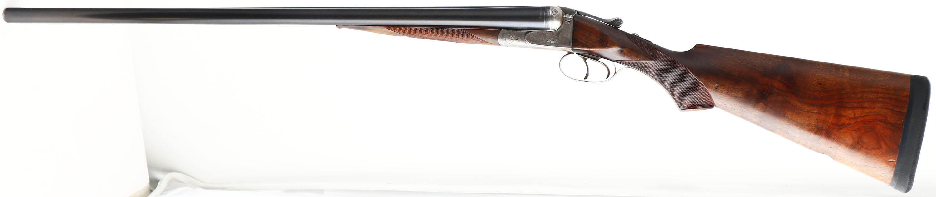 J.P Sauer & Son, Hammerless Shotgun, CAL: 12 GA, MFG: 1906, SN: 117065, Break Action SxS Shotgun, 28'' barrel. Both barrels are marked ''J.P SAUER & SON'' & ''KRUPP ESSEN'' near the chamber. Both sides of the receiver are marked ''J.P. SAUER & SON'', over the screws. Matching SN's can be found on the lower tang, floor plate, left barrel & a partial matching SN is on the forend. Floor plate & left barrel are marked ''MADE IN PRUSSIA''. The checkered flat pistol grip stocks are very good, having been lightly sanded & refinished. There are smoothed contusions, nicks & dings. The forend has a small edge chip repair at the tip. The checkering has been retraced & is sharp. There is an inlaid blank oval silver nameplate on the belly of the stock. The original metal blue finish on the barrels rates 85%, with areas wearing thin, toned to a thin brown patina. The case-hardened receiver has mostly worn to a mix of metal gray & brown patina, with remnants of case-colors in protected areas. Intricate ornamental scroll engraving on the receiver, break lever, trigger guard, forend metal components, screws & barrel rib end. Bores are excellent. The solid matted rib holds a single front bead. Stock has a Decelerator solid black rubber recoil pad. A partially restored quality German shotgun from the early 1900's. FFL or C&R Req. - Value: 1500 to 3000