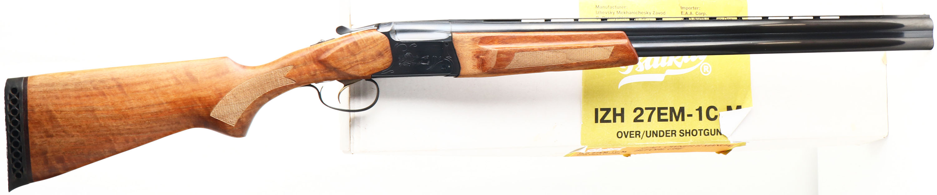 BOXED, Baikal (Russia), Model IZH-27EM-1C-M, CAL: 12 GA, MFG: Modern, SN: 992732949B, Break Action O/U Shotgun, 27 3/8'' barrels with ventilated rib. The checkered flat pistol grip stocks are excellent. The metal blue finish rates 98% overall. The receiver displays simple game scenes with accent border engravings. Bores are excellent. The ventilated rib holds a single front bead. Stock has a Baikal ventilated black rubber recoil pad. Comes in factory box, with related paperwork & choke tool. Box condition is very good, with edge/corner wear & the label is torn. FFL Req. - Value: 200 to 400