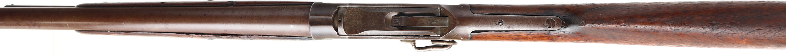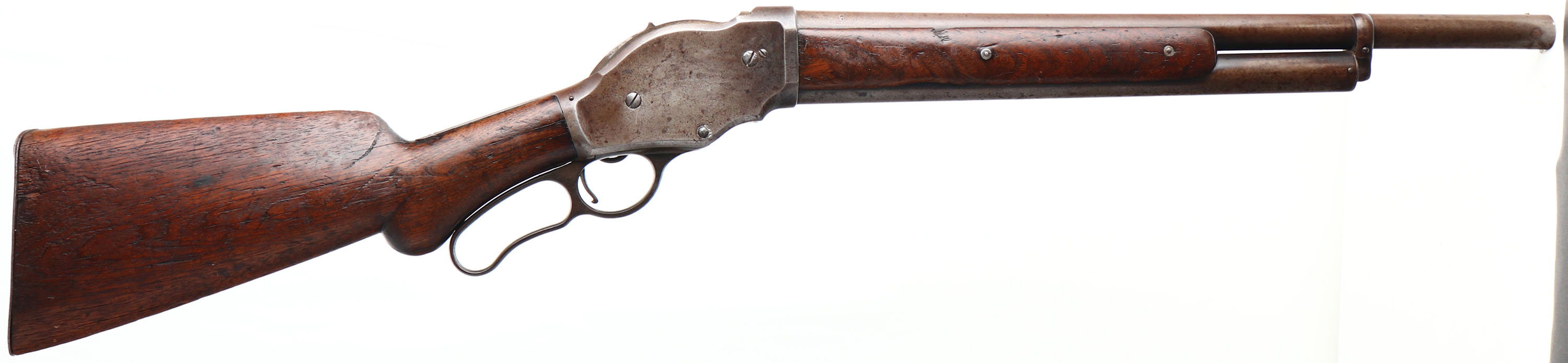 RARE Winchester, Model 1887 Repeating Shotgun, Sling Ring & Staple Riot Gun, CAL: 12 GA, MFG: 1897, Antique, SN: 61880, Lever Action Shotgun, CYL Bore, 20'' barrel. This particular shotgun is stamped ''S.P. R.R.'' on the left side of the receiver for the Southern Pacific Railroad. These early riot guns were used by express messengers, watchmen, prison guards, train hands & law enforcement. They were made with cylinder bore barrels, bored expressly to shot buckshot. With five rounds in the mag & one in the chamber, they were promoted as a superior 6 shooter to the revolver for shooting in the dark or where aim is uncertain, as the buckshot cartridge contained nine bullets compared to a single bullet by a revolver cartridge. This shotgun shows all the authentic wear of its time on the railroad. The original, round knob pistol grip wood stock is fair to good & remains solid, despite being very weathered, oil darkened & having several dry weathered & stress cracks at the wrist, end of tangs & along the sides. The two-piece forend is fair to good, heavily worn, with edge chips, nicks, numerous contusions & scratches, all consistent with its age & use. The metal finish has toned to a mix of gun metal gray & a spotty brown patina, with speckling & pitting. Rare sling ring on staple bar located on the left side of receiver. Bore is good, with spotty areas of roughness. The barrel holds a single front bead. Buttstock carries a checkered metal buttplate. An early lever repeater shotgun, with likely a lot of stories to tell. Antique, No FFL Req. - Value: 800 to 2000