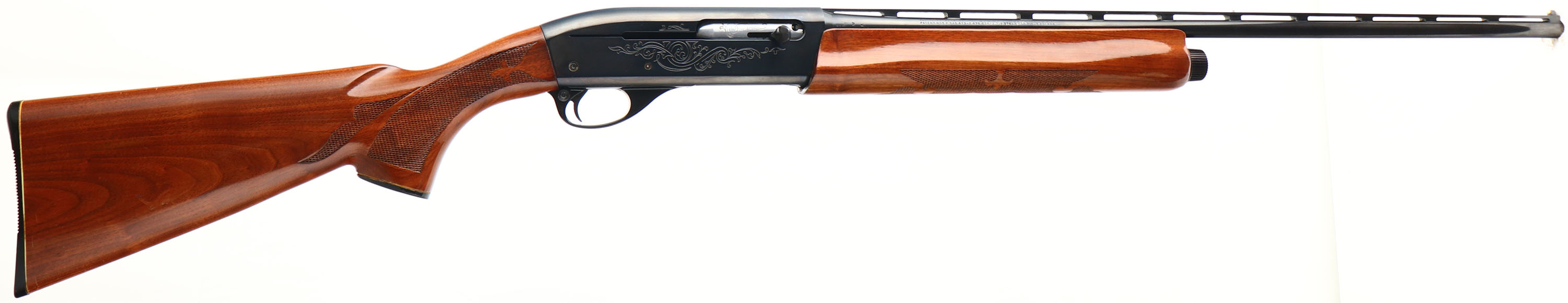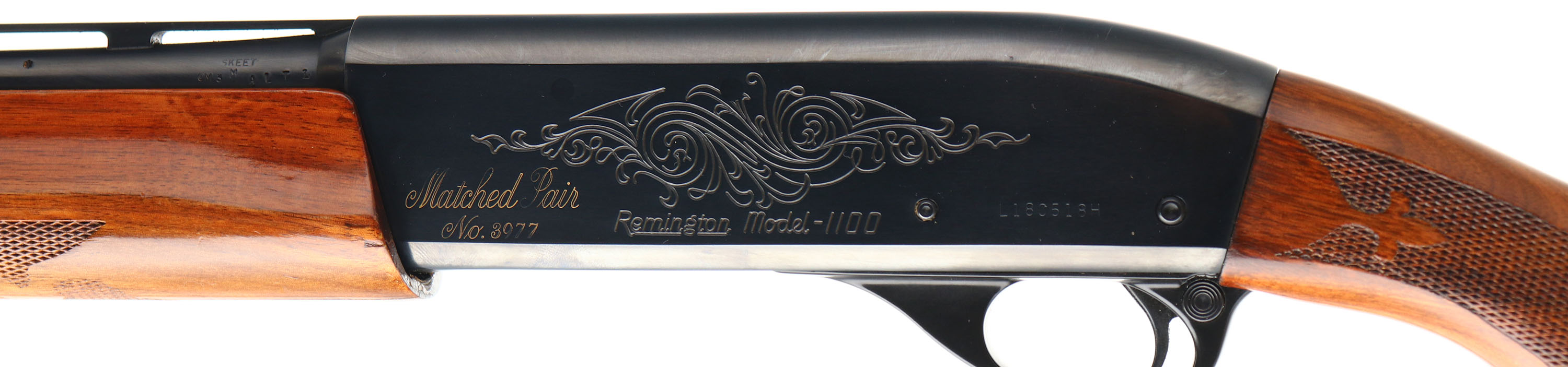 Remington, Model 1100, CAL: 410 GA, MFG: Modern, SN: L180518H, Semi Auto Shotgun, Choke: Skeet, 2 1/2'' Chamber PLASTIC SHELLS ONLY, 25'' Ventilated rib barrel. This is one half of a ''Matched Pair No. 3977'', as so engraved on the left side of the receiver, the other gun not in auction. The original checkered & capped pistol grip wood stocks are excellent, with a few minor scratches or contusions to the original finish. The metal blue finish rates 98% overall, Bore is excellent. The rib holds a small mid rib bead & front white bead. Buttstock carries a Remington buttplate. LOP 13 7/8''. An excellent original condition 410 ga shotgun. FFL Req. - Value: 600 to 1200