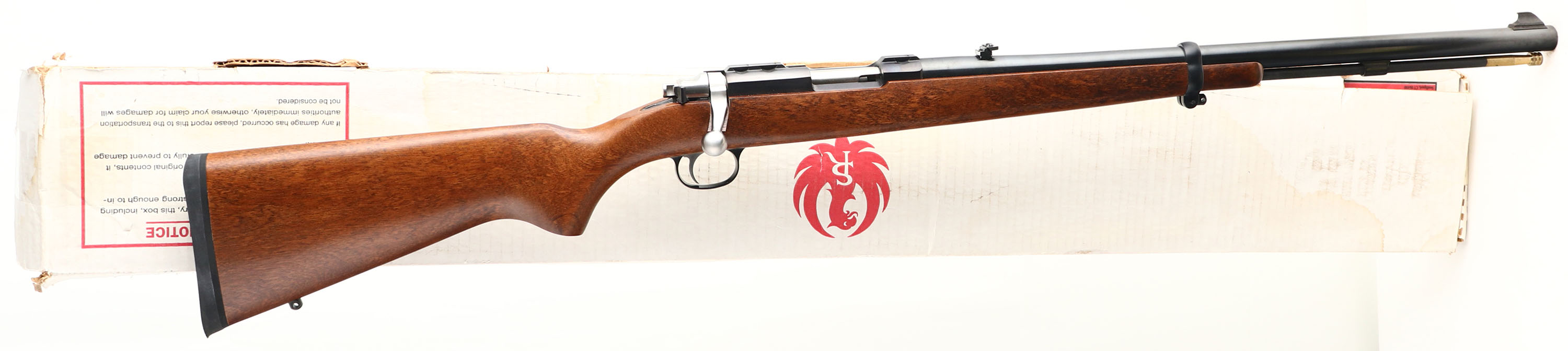 BOXED, Ruger, Model 77/50, CAL: 50, MFG: Modern, SN: 730-19431, Percussion Blackpowder Bolt Action Rifle, 22'' barrel. The flat pistol grip wood stock is excellent. The metal blue finish on the barrel & receiver rates 99%, with the receiver beginning to tone plum. Bore is mint. The barrel holds a folding leaf rear sight & blade front sight. The receiver has an integral scope base. Stock has sling studs & a solid black rubber recoil pad. Comes in factory box, with related paperwork & scope rings. NIB. Blackpowder, No FFL Req. - Value: 300 to 600