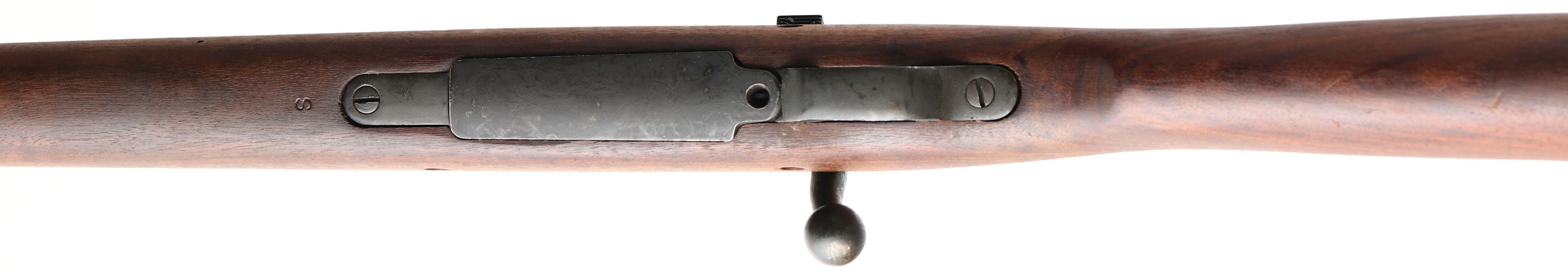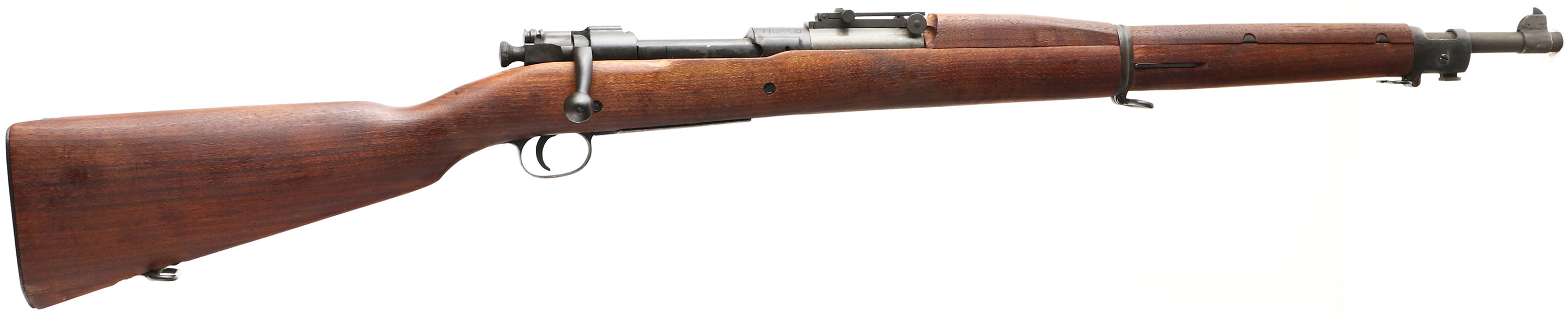 Springfield Armory. Model: 1903 Mark 1. Cal: 30-06. : MFG: 1920. S/N: 1152230. Bolt Action Rifle. 24'' Round Barrel. Only 29,000 of this model were ever made & were meant for use in conjunction with a experimental device called the Pedersen device, it was device made to shoot .30 caliber pistol rounds that would replace the bolt of the 1903 Springfield turning your rifle 5 shot rifle, into a 40 shot pistol caliber rifle, the cartridge was known to be underpowered & the war ended before they saw any frontline use, most of the Pederson devices were destroyed making them quite rare, & the rifles would just go back into inventory as standard line rifle. This rifle also has a 1943 replaced barrel with a Type C stock, the type C stock was deigned in 1929 initially for the national match rifles but was approved for use on service rifles in that same year and would be used once the supply of the older type S stock was exhausted, the type C differs from the type S in having a semi-pistol grip & no finger grooves. When they introduced the Type C stock they made a new model for the rifle, & any 1903 rifle that was made with a type C or had its stock replaced with a type C would be marked down as a M1903A1, unless it was the later 03-A3, technically making this rifle a M1903 mark I A1. The replaced Semi-pistol grip walnut stock is excellent, with very little to no wear, ''RA-P'' cartouche in left side of stock above trigger, RA stands for the Raritan Arsenal where they replaced the stock & barrel, ''S'' stamp on bottom of stock Infront of magazine. The Parkerized metal finish rates 90% overall, the parkerized finish is not original but was likely done when it was re-arsenaled. Front top of receiver is marked, ''U.S.'', ''SPRINGFIELD ARMORY'', ''MODEL 1903 MARK I'', S/N, Top end of barrel is marked, ''H S'', flaming bomb, ''10-41'', The H S is a High Standard MFG Co barrel, rear barrel band is marked ''U''. Bore is excellent, bright & shiny with strong rifling. Blade front sight with a windage & elevation adjustable U notch ladder rear sight, marked 4 to 27 on top. Metal Butt plate, with trapdoor. Bottom sling swivels & stacking swivel. FFL or C&R Req. - Value: 1000 to 2000