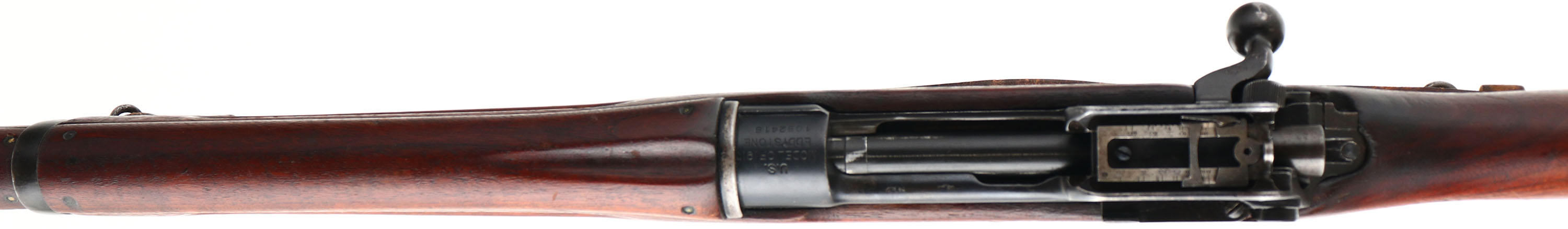 Remington. Model: 1917. Cal: 30-06. MFG: 1918. S/N: 1052418. Bolt action Rifle. 26'' Barrel. The semi Pistol grip wooden stock is very good with minor scratches, dings, & wear from use/age, no visible cartouches on stock. The metal finish rates 85% overall with worn bluing on the edges. Top of receiver is marked ''U.S.'', ''MODEL OF 1917'', ''EDDYSTONE'' & S/N, end of barrel is marked ''E'', flaming bomb, ''11-18''. Bore is very good, bright with roughness near muzzle. Blade Front sight with protective wings, aperture ladder rear sight marked 2 to 16. Metal trapdoor Butt plate that has wear & roughness. A excellent example of a WW1 US Rifle. FFL or C&R Req. - Value: 600 to 1200