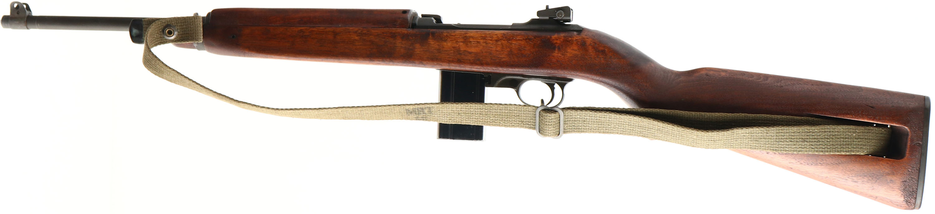 Winchester, Model M1 Carbine, Cal: .30 Carbine, MFG: 1945, S/N: 6565910, Semi-auto rifle, 18'' barrel. The Semi-pistol grip Type 3 stock is very good with light scratches, dings & wear from use/age, stock has darkened from oil/age, faint Springfield arsenal crossed cannons crest on right side of stock on the cheek, faint markings on inside sling well. The grey parkerized metal finish rates 85% overall with areas of light wear & scratches. Rear of receiver is marked with ''WINCHESTER'', & S/N, front of receiver is marked ''U.S. CARBINE'', ''CAL .30M1'' top of barrel is marked ''W''. Bore is good, bright & clean bore with worn but still present rifling. Blade front sight with protective wings, has the updated windage & elevation adjustable rear aperture sight marked 1 to 3. Checkered steel butt plate. Side sling mounts. Has oilier bottle & green canvas sling. The rifle has the original push through safety. Rifle comes with one 15 Rd. mag, a nice rifle with a mix of old & updated parts. FFL or C&R Req. - Value: 1400 to 2800
