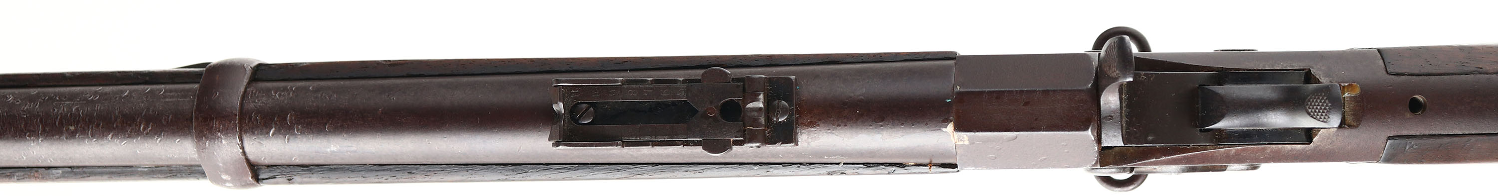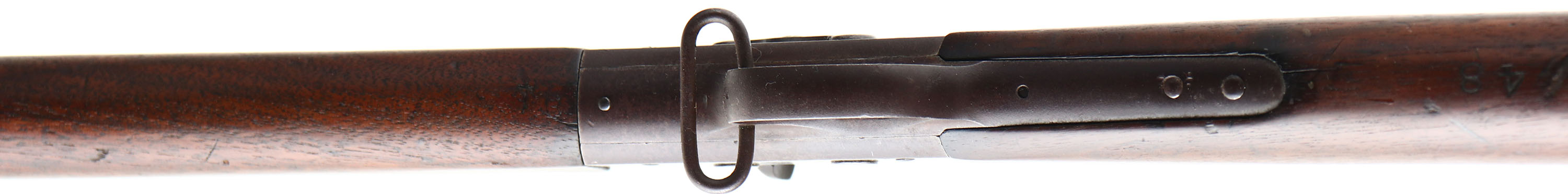 Remington, Model Rolling block, Cal: .43 Spanish, MFG: 1870-80's, S/N: 1848, Rolling block single shot, 28'' barrel. The two piece straight wrist sock is good with scratches, dings, & wear frame use/age, two cracks on stock on eon left side by receiver & on by lower tang, ''48'' marked on bottom of stock. The metal has toned to a brown patina with areas of gray metal, S/N is marked twice on left side of frame under stock, no other markings on the rifle. Bore is very good, bright with some roughness. Barrel holds a barleycorn on block front sight with a stepped tangent/ladder wide V-notch rear sight marked 1 to 4 on base & 5 to 11 on ladder. Stock carries a steel butt plate that has cleaned pitting & patina. On sling loop on trigger guard. Has cleaning rod. Antique No FFL Req. - Value: 500 to 1000