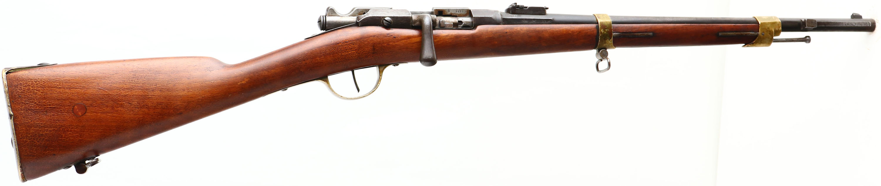 Manufacture d'armes Chatellerault, Model: MLE 1874 Artillery Musketoon (Fusil Gras), Cal: 11x59mmR, MFG: 1883, S/N: A94809, Bolt action single shot rifle, 2 1/4'' barrel. The straight wrist wood stock is good, stock has been sanded & heavily sanded in areas & re-finished, lower tang, upper tang, lower sling loop base, & butt plate are proud to the wood, very faint S/N marking on left cheek that vaguely looks like the S/N on the gun, dogwood plug on right cheek that marks French government property but the cartouche over it has been sanded away. The metal has toned to a even dark gray patina with areas of wear and bear metal showing in spots. Left side of receiver is marked ''MANUFACTURE D'ARMES CHATELLERAULT'', ''MLE 1873'', ''M80'' & some faint proof marks, left side of barrel is marked with S/N, ''JH'', & some proofs, right side of barrel is marked ''C 1883'', ''MA'', & some proofs. S/N matched bolt & bayonet lug. Bore is fair, bright & mirror like with heavily worn but still present rifling. Barrel holds a barleycorn on black front sight with a flip up ladder deep V-notch rear sight marked 5 to 11. stock carries a heavily worn & dinged brass butt plate. Has bottom sling loops. Has a S/N mismatched cleaning rod. The Gras was France's first metallic cartridge loading rifle & is a conversion of the earlier Chassepot rifle which was a needle fire paper cartridge. With metallic cartridges just being invented & tested out, it was common to have case ruptures when firing & without any safety mechanisms put in place the escaping gas could be a real issue for the shooter & that was a problem with this rifle, so in 1880 a channel was cut into the bolt to vent the gas from a ruptured case away from the shooters face, rifles with this update will be marked M80 on the receiver which is present on this rifle. The Artillery Musketoon was meant for the artillery troops, they still needed a rifle but it also need to not get in the way of their main duty of operation the cannons & artillery, they might still encounter main line infantry if there is a break through or if the cannons run out of ammo & get they pushed up to fill the main ranks so you cant just give them a normal cavalry carbine they needed a bayonet, so a lot of country's around this period made the artillery crews their own model of rifle. Antique No FFL Req. - Value: 300 to 600