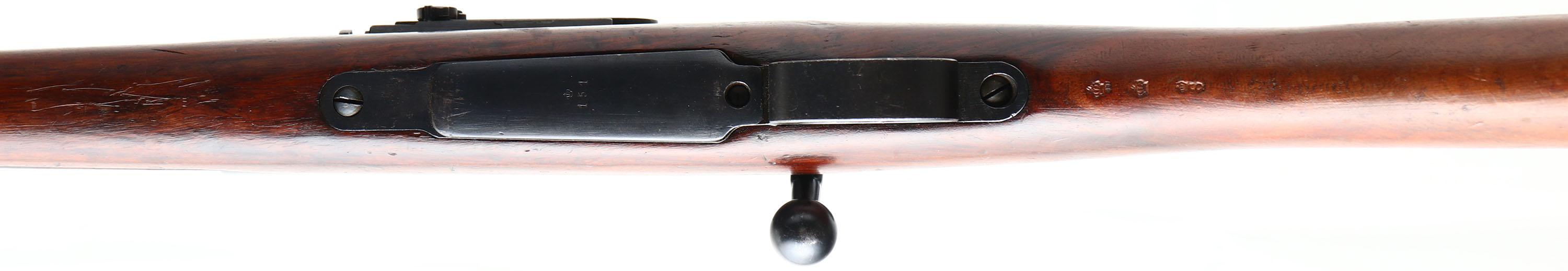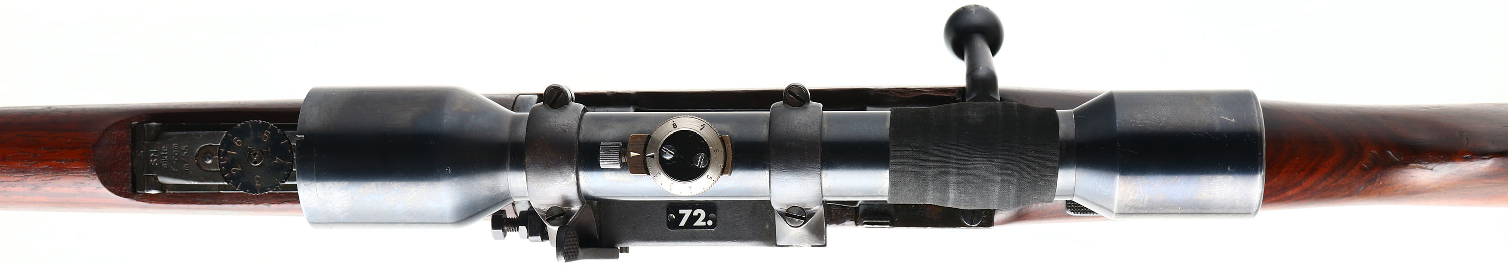Carl Gustafs Stads Gevarsfaktori, Model: Gevar M1941B, Cal: 6.5x55mm, MFG: 1912, S/N: 306151, Bolt action rifle, 29 1/4'' barrel. The straight wrist wood stock is very good with light nicks, dings, scratches & stains, brass bore/info disc embedded into right cheek of stock, four small screw holes from where a brass trajectory range plate was removed. Three crown proofs on bottom of wrist. The blued metal finish rates 95% on the receiver & 85% on barrel with some light rust & thinning. Top of receiver is marked with a crown over a Swedish latter, ''''CARL GUSTAFS STADS GEVARSFAKTORI'', ''1912'', left side of the pined in scope mount is marked with S/N, scope mount is marked with S/N, & ''72''. S/N matched bolt, scope mount, barrel bands, & butt plate. Bore is excellent, bright & mirror like with strong rifling, has only a few small spots of light roughness. Barrel holds a wide wedge front sight with add on hood, rear sight is the updated SM Sikte F-ram sight for the newer boat tail ''Torped'' ammunition, sight is dated 1955, rear sight is a twist knob U-notch marked 1 to 6, rifle also has the original AJACK 490 scope, scope is marked on the knob base ''Nn1683/1941B''. stock carries a steel butt plate, has patina & cleaned pitting. Bottom sling loops. Has cleaning rod. Comes with original scope carrying case & orginal scope lens cover. In 1941 Sweden adopted a sniper rifle for its military & for the sniper rifles they would take the best shooting M1896 rifles they had & would drill & tap the receiver & mount a scope, & then add a bent bolt handle so they could actually cycle the rifle, this new rifle would be designated the M1941. Then in 1955 the Swedish Government refurbished all the snipers they still had in inventory to a new pattern the M1941 B where they changed the rear iron sight, & fixed a few quality of life issues with the scope mounts like adding the S/N to the side, adding stop screws to prevent over tightening, & peening in the locking screws on the mount, they also got rid of the older M/44 telescopic sight if it had it & made sure all rifles had the AJACK 4x90 scope. Overall a really nice condition Swedish sniper rifle from WW2. FFL or C&R Req. - Value: 2000 to 4000