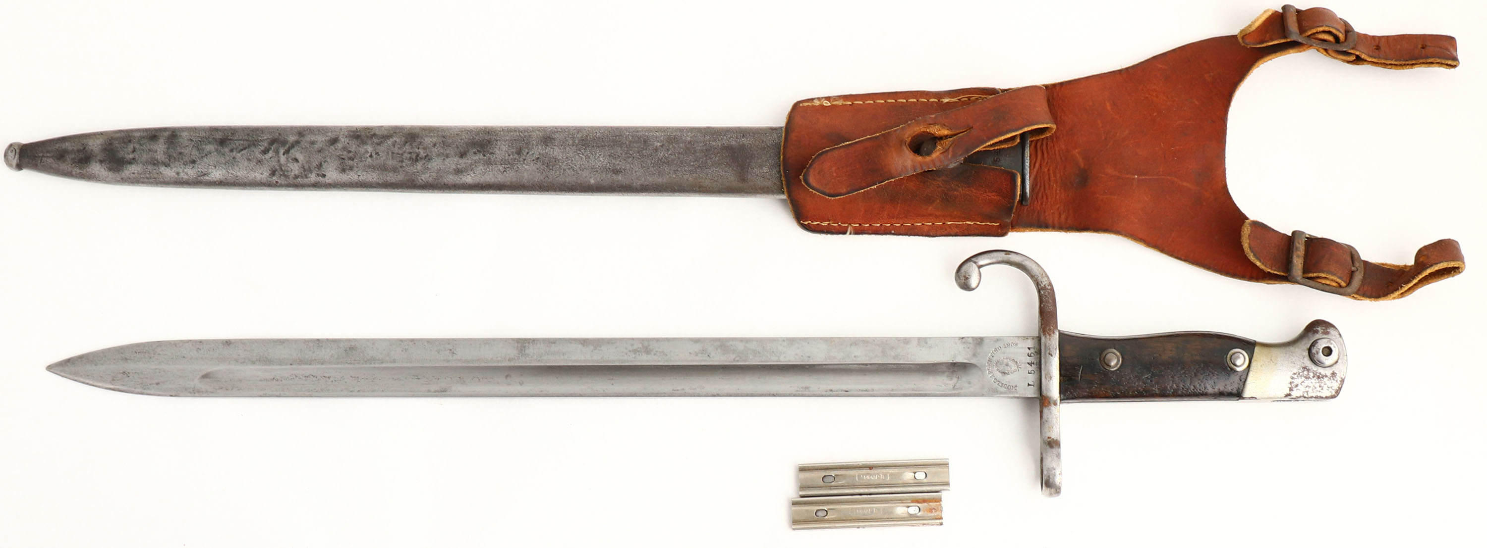 DWM, Model: 1909 Argentine, Cal: 7.65x53mm Mauser, MFG: 1911, S/N: M8531, Bolt action Rifle, 29'' barrel. The original semi-pistol grip wood stock is excellent with only minor dings/dents, faint cartouches on right side of stock by cheek, one faint cartouche on top of handguard Infront of rear sight, S/N marked into right side of stock below S/N on receiver. The metal finish on the barrel rates 75% with wear & spots of thinning, The receivers on these rifle were left in the white from the factory, the receiver has also been polished. Top of receiver is marked with the Argentina coat of arms, left side of receiver is marked ''MAUSER MODELO ARGENTINO 1909'', ''DEUTSCHE WAFFEN-UND'', ''MUNITIONSFABRIKEN BERLIN'', right side of receiver is marked with S/N, Bore is excellent, bright & mirror like with little to no wear. Barrel holds a barleycorn front sight with a tangent V-Notch rear sight marked 3 to 20. stock carries a steel butt plate with patina & light dings, bayonet lug is also chromed, comes with cleaning rod, original bayonet with sheath & frog, & two original stripper clips. FFL or C&R Req. - Value: 400 to 800