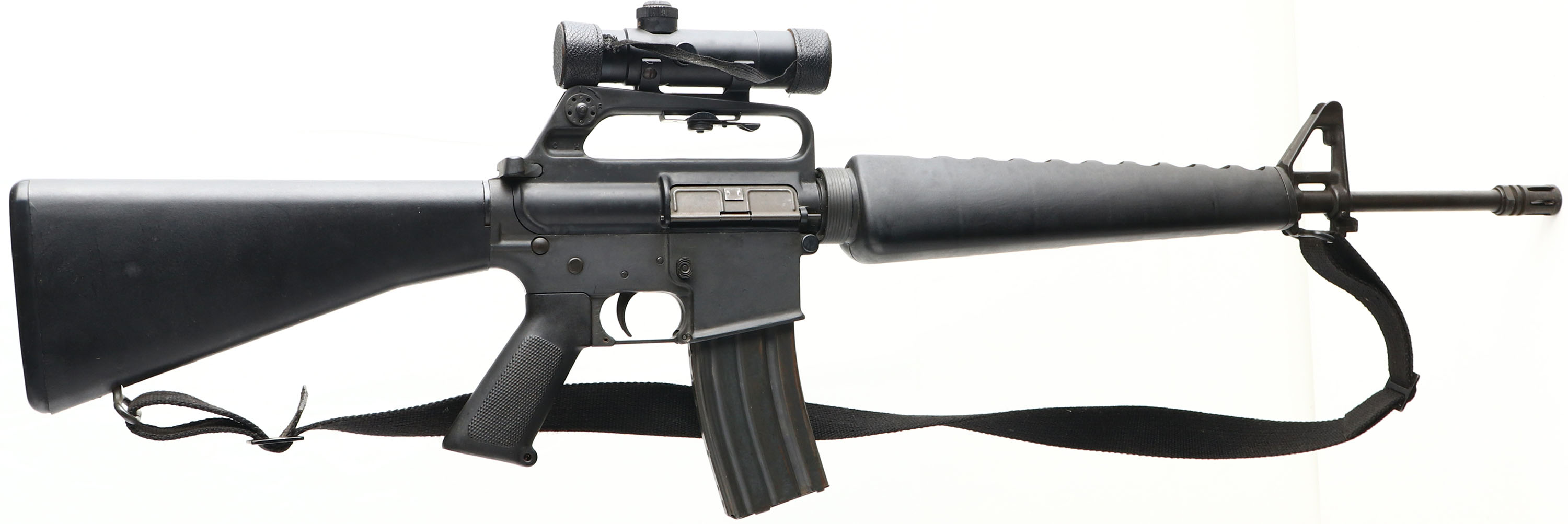 Colt, Model: AR-15 SP1 Pre-ban, Cal: .223, MFG: 1979-93, S/N: SP204887, Semi-auto rifle, 20'' barrel. The polymer stock, handguard & pistol grip are very good with light scratches. The metal finish rates 90% overall with light wear & scratches. Left side of receiver is marked with the rampant colt in circle logo, ''COLT'', ''AR-15'', CAL: .223'', ''MODEL: SP1'', S/N, ''COLT'S FIREARMS DIVISION'', ''COLT INDUSTRIES'', ''HARTFORD, CONN.'', ''U.S.A.'', top of barrel is marked ''C MP CHROME BORE''. Bore is excellent. Barrel holds a post front sight with protective wings, carry hand has a 2 position aperture rear sight, also comes with a colt 3X scope that mounts to carry handle, scope is marked ''COLT'', ''3 x 20''. Stock carried a plastic, checkered trapdoor butt plate. Bottom sling loops. Comes with black nylon sling, bayonet with sheath, & one 30 Rd. mag. A excellent example of the early Colt AR-15 with some nice accessories. FFL or C&R Req. - Value: 1500 to 3500