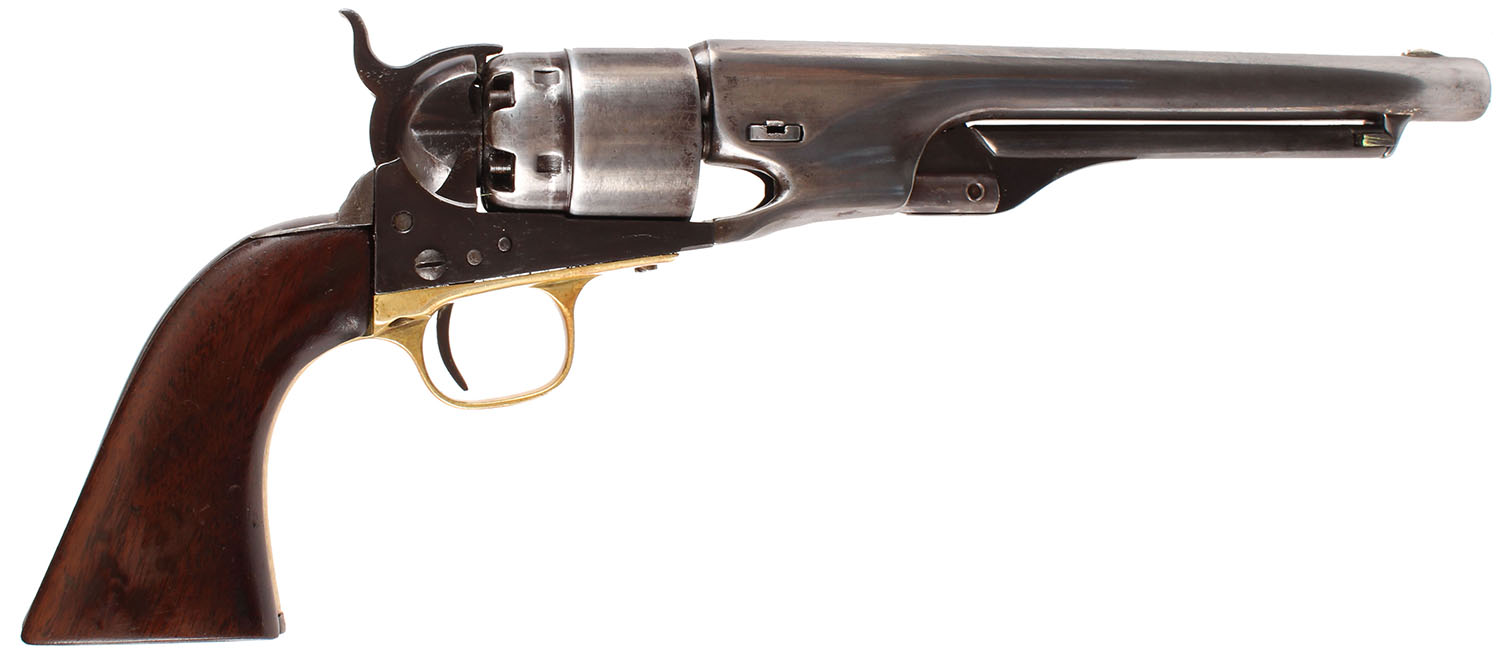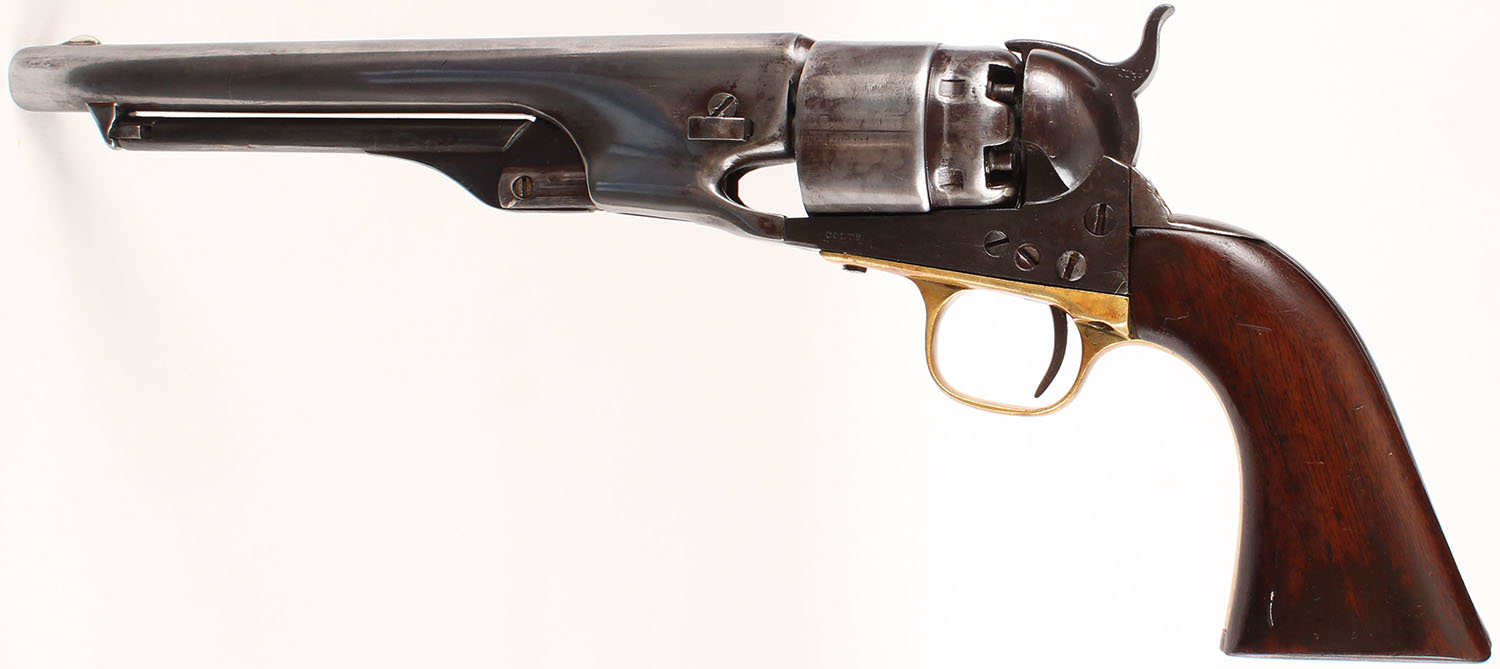 Colt, Model 1860 Army, CAL: 44, MFG: 1861, SN: 14453, Single Action Percussion Revolver, 8'' barrel. Civil War Era. The top of the barrel has a worn roll-stamp that reads: ''ADDRESS COL. SAM L COLT NEW-YORK U.S AMERICA'' & ''COLTS PATENT'' is faintly stamped on the left side of the frame. No visible caliber marking. The Naval scene on the cylinder is not visible. All matching SN on the barrel housing, frame, trigger guard, wedge & arbor. There is a non-legible cartouche behind the trigger guard (maybe a ''D'') & a ''C'' stamped on the top of the backstrap. The replaced wood grips are very good & solid having been sanded, refinished. There are contusions, dings, visible striations & thinned applied finish. The metal finish is a mix of metal gray & brown patina. The barrel & cylinder have been buffed & polished. The brass trigger guard has an orange/aged patina. Bore is good, with roughness & pitting amongst strong rifling. Small blade front sight. Antique, No FFL Req. - Value: 800 to 1400