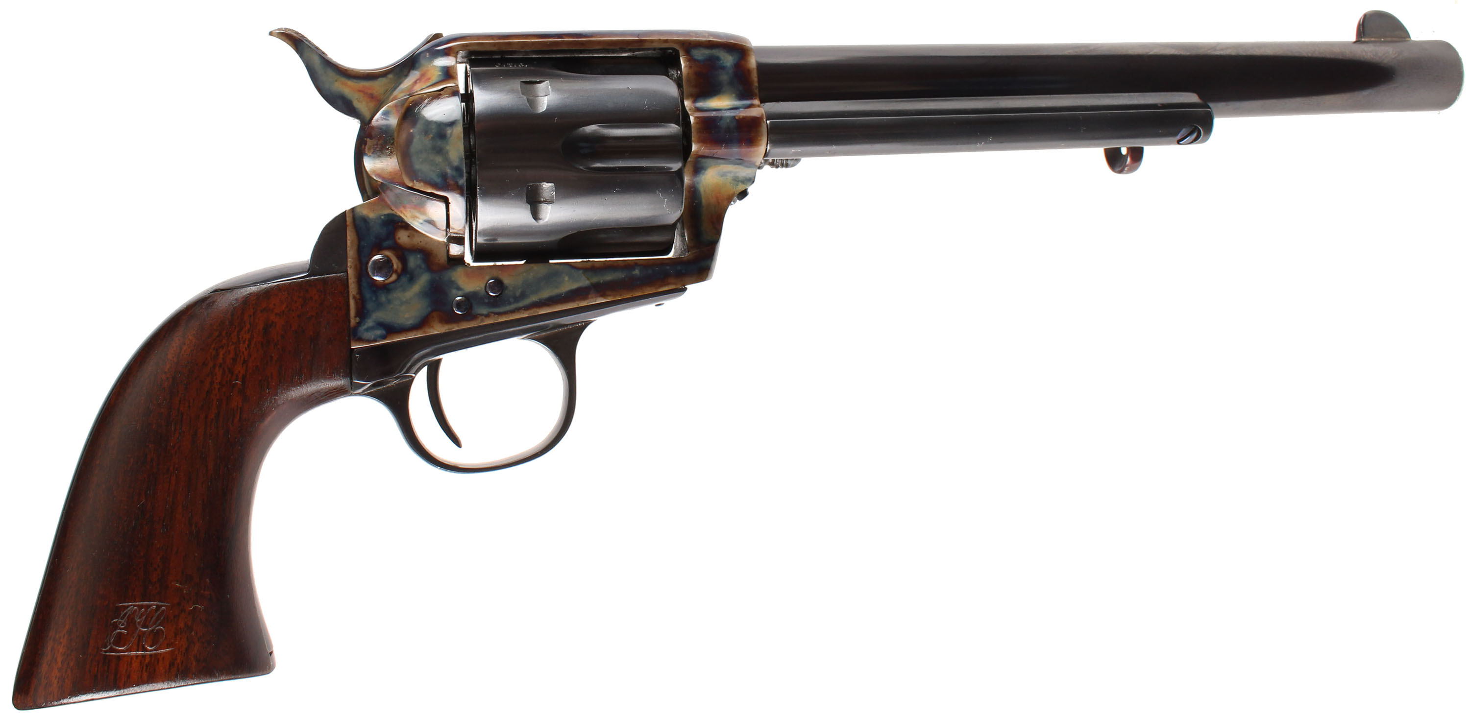 Colt, First Gen Single Action Army U.S Marked, CAL: 45 COLT, MFG: 1877, SN: 35517, Single Action Revolver, 7 1/2'' barrel. This gun has been fully & professionally restored. All matching SN on the butt, trigger guard, frame & cylinder. The inspector initials ''J.T.C'' can be found on the frame above the SN, bottom of barrel & cylinder. There are two cartouches on the left grip, ''1877'' over an upside-down cursive ''JH'' cartouche in a square. The right grip has the same right side up cursive ''JH'' cartouche. The cartouches are thin from the grips being refinished, but are still very legible. The top of the barrel has a one line address ''COLT'S PT. F. A. MFG CO HARTFORD, CT. U.S.A''. The left side of the receiver has a two line patent date ''PAT.SEPT.19.1871, JULY2.72, JAN.19.75'' & a ''U.S'' marking. The markings on the frame appear thin. The cylinder has a partial matching SN. The full SN can be found on the frame. The original wood grips are excellent, having been lightly sanded & refinished. The metal blue finish on the barrel & cylinder rates 97%. The case-hardened receiver & hammer display bright case colors. Bore is excellent, with mirrored appearance. V-notch rear groove & tall blade front sight. Comes with a Colt Factory letter. The records on this revolver do not provide the barrel length or type of stock, they label it as ''Not Listed'', however there is a ''Remarks'' paragraph below the record that states: ''As noted above, the records do not provide information with regard to the barrel length of revolver or the type of stocks. However, this is usually an indication of a 7 1/2'' barrel length and walnut stocks as these were considered standard issue for that time period.''. This revolver still presents excellently having been professionally restored. No FFL Req. - Value: 2000 to 6000