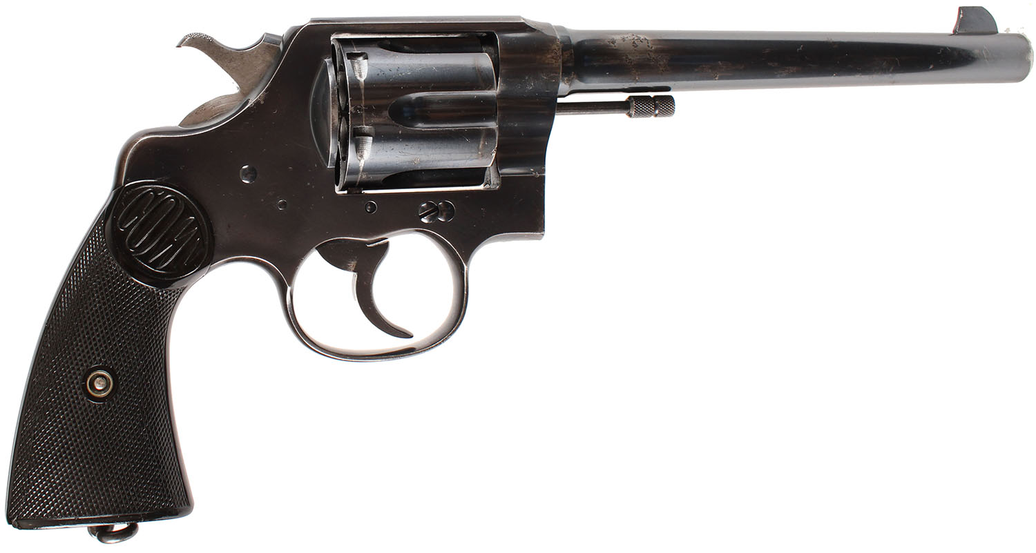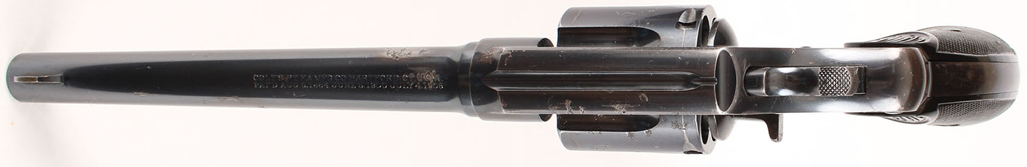 Colt, New Service Commercial Model, CAL: 44-40, MFG: 1922, SN: 316989, Double Action Revolver, 7 1/2'' barrel. The top of the barrel is stamped with two line address & patent dates. The left side of the barrel is marked ''NEW SERVICE 44-40'' & the left side of the frame displays a clear Rampant Colt. The original Colt marked checkered hard rubber grips are good. The right grip has an edge chip & a 2'' glue repaired crack, otherwise condition is very good. The metal blue finish rates 80% overall, with intermittent cleaned pitting & small areas worn to metal gray, toned to a thin brown patina. Bore is excellent. U-notch rear groove & large fin shaped blade front sight. Lanyard loop present. This example has the more desirable flat cylinder latch. FFL or C&R Req. - Value: 1000 to 2000