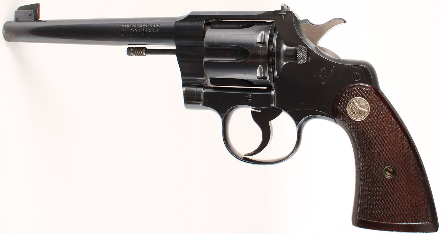 Colt, Officers Model Target Third Issue, CAL: 38 SPL, MFG: 1936, SN: 599974, Double Action Revolver, 6'' barrel. The top of the barrel is marked with a two line address & patent dates. The left side of the barrel is marked in two lines ''OFFICERS MODEL 38 HEAVY BARREL'' & the Rampant Colt logo is clearly stamped on the left side of the frame. The Colt logo medallion wraparound checkered grips are excellent. The original metal blue finish rates 97% overall. Bore is excellent. Adjustable square notch rear sight & pinned blade front sight. Checkered backstrap. FFL or C&R Req. - Value: 1000 to 2000