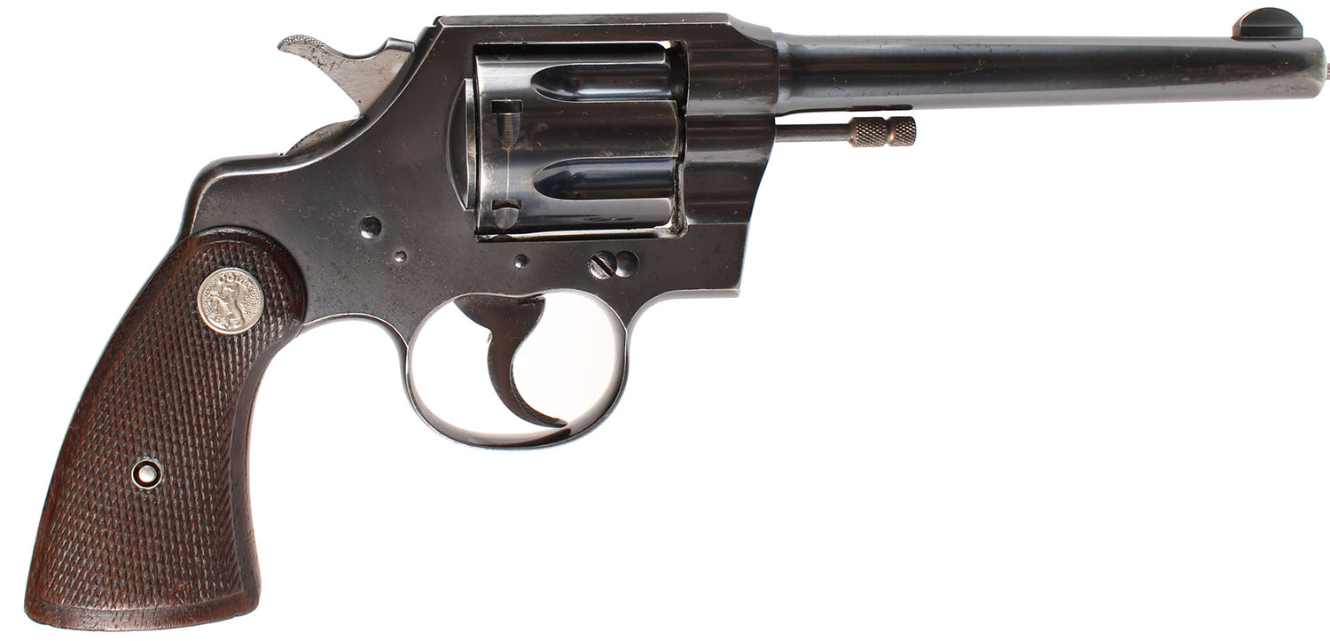 Colt, Official Police Pre-War, CAL: 22LR, MFG: 1939, SN: 13808, Double Action Revolver, 6'' barrel. The Colt logo medallion pre-war checkered walnut grips are very good & solid. There is consistent overall wear to the grips. Confirmed pre-war grips by the three stud holes visible on the reverse top of both grip panels. The original metal blue finish rates 85% overall, with spotting/speckling toned to a brown patina. Bore is excellent. Square notch rear groove & blade front sight. A desirable .22LR variation of an Official Police Revolver. FFL or C&R Req. - Value: 500 to 900