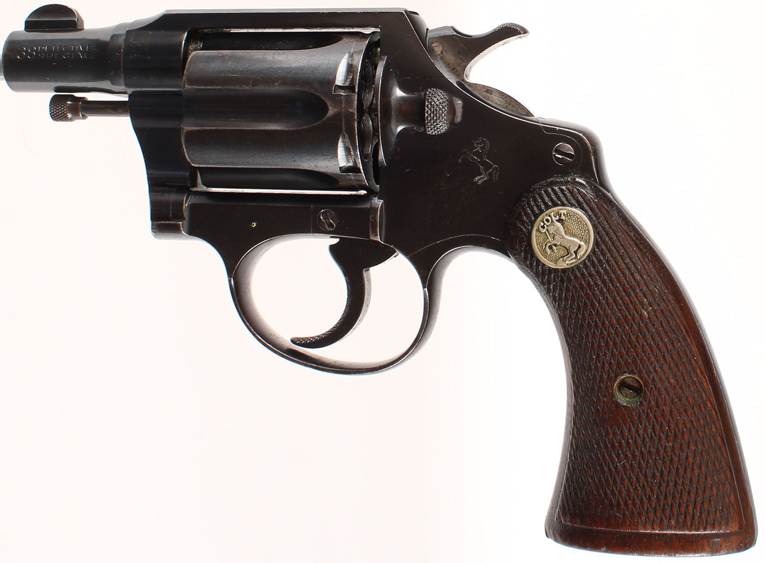 Colt, Detective Special Pre-War 1st Issue, CAL: 38 SPL, MFG: 1932, SN: 410140, Double Action Revolver, 2'' barrel. The original Colt medallion two-piece checkered wood grips are excellent. There are dings, scrapes & the checkering is beginning to wear smooth. The original metal blue finish rates 85% on the barrel, cylinder & frame, with additional wear to the straps. Bore is excellent. Square notch rear sight & blade front sight. FFL or C&R Req. - Value: 900 to 1600