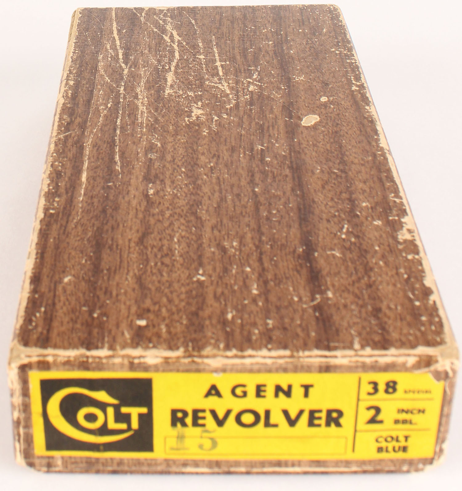 BOXED, Colt, Agent, First Issue, CAL: 38 SPL, MFG: 1962-72, SN: 156724, Double Action Revolver, 2'' barrel. The silver Colt medallion checkered wood grips are mint. The original Colt high polish metal blue finish rates 100% overall. No drag line. Bore is mint. Never been fired. Factory sights. Comes in original, correct label wood grain box, with original wax paper & insert. Box is very good, with edge & corner wear. These revolvers are similar to the Colt Cobra first issue, except with a shorter grip frame. This example is one of, if not the highest condition Colt Agent revolver we've seen. FFL or C&R Req. - Value: 1000 to 2000