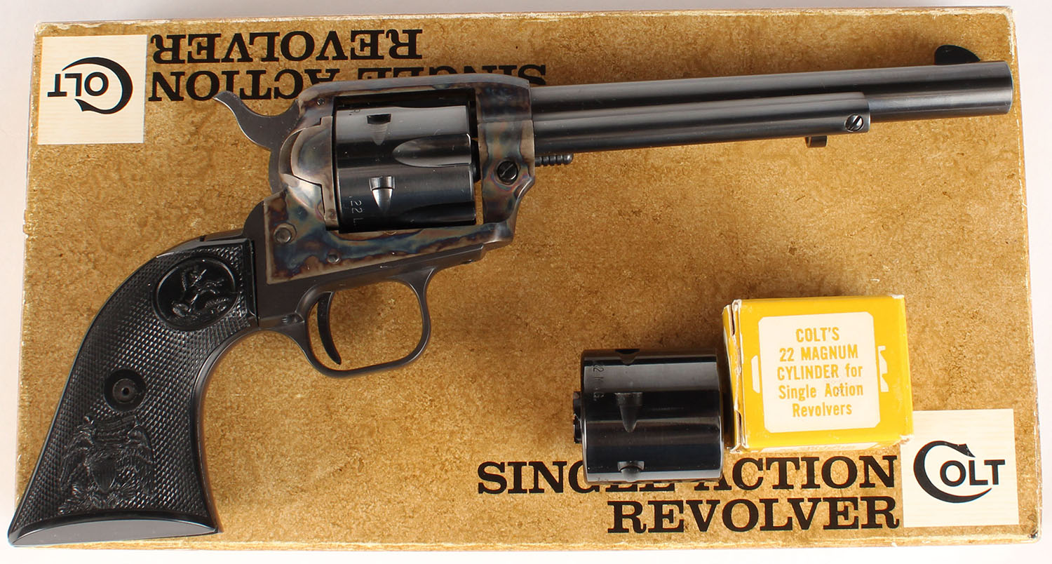 NEW, BOXED, Colt, Peacemaker 2nd Gen, CAL: 22LR/22WMR, MFG: 1973, SN: G79677, Single Action Revolver, 6'' barrel. The top of the barrel is marked ''COLT'S PT F.A. MFG. CO. HARTFORD CT. U.S.A.''. The left side of the barrel is marked ''PEACEMAKER 22''. The left side of the frame is marked with the Rampant Colt logo above the trigger guard & next to patent dates. The full SN can be found on the bottom of the frame. The original Rampant Colt & E.Pluribus Unum Eagle plastic grips are excellent. The factory metal blue finishes rate 99%+. The case-hardened frame displays vivid case-colors. Bore is excellent & bright. Factory groove & blade front sight. Comes in the original factory box, with correct label, leatherette outer cardboard sleeve, 22 WMR cylinder in original box & original wax paper. Box condition is excellent. FFL Req. - Value: 800 to 1200