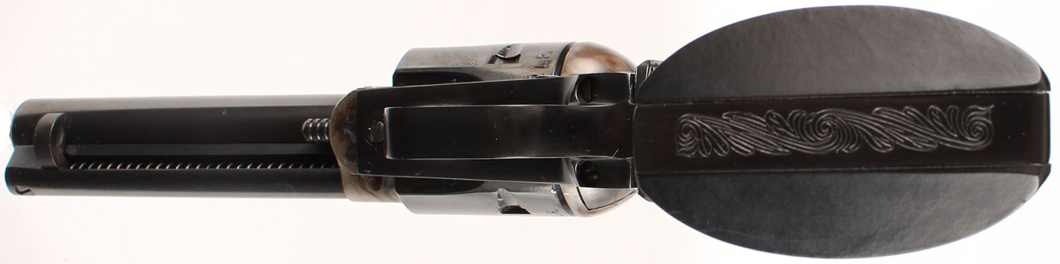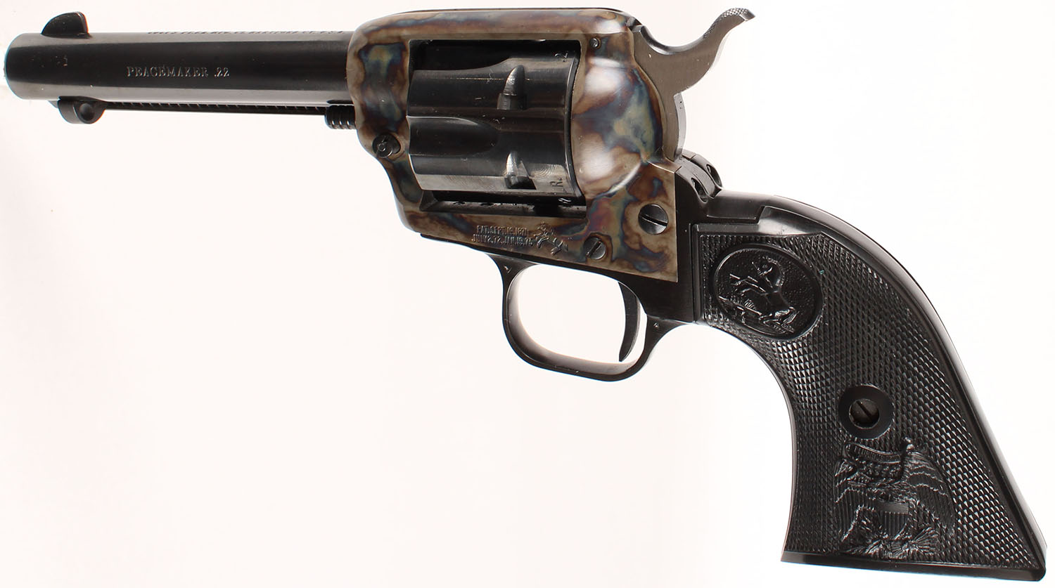 Colt, Peacemaker, CAL: 22 LR/22 MAG, MFG: 1974, SN: G112761, Single Action Revolver, 4 3/8'' barrel. The original E. Pluribus Unum & Rampant Colt checkered plastic grips are excellent. The metal blue finish on the barrel & cylinder rates 99%. The case-hardened frame displays vivid case-colors. The case-colors on the right side of the frame have slightly faded. Bore is excellent. Rear groove & blade front sight. Comes in the original Colt styrofoam packaging, no cardboard box. Included is the 22 MAG cylinder in original packaging. FFL or C&R Req. - Value: 600 to 1000