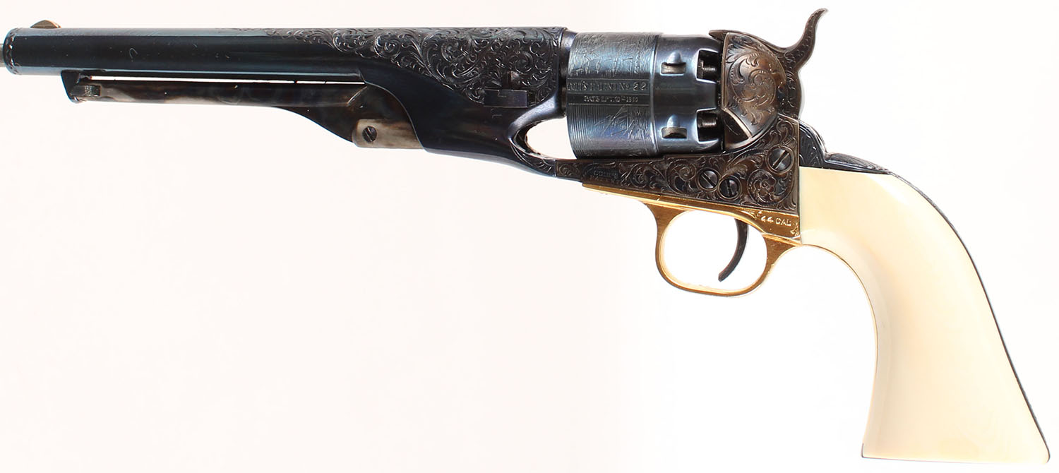 FACTORY ENGRAVED, Colt Presidential Edition Miniature 1860 Army, CAL: 21, MFG: 1980's (1987 Ship Date), SN: 122, Functioning Non-Firing Single Action Revolver, 3 3/4'' barrel. This is a 47% scale miniature Colt 1860 ''Presidential Edition'' Army revolver sold by the United States Historical Society. These were a limited edition made by Uberti in Italy, under license from Colt, for the U.S. Historical Society in the 1980s. These fancy engraved ''Presidential Edition'' miniature Colts were made in far fewer numbers than the normal plain ''Classic Edition'' models, & were far more expensive. The genuine ivory grips are excellent. The metal blue finish on the barrel, cylinder & backstrap rates 99%. The case-hardened frame, hammer & ram rod all retain vivid case-colors. The gold tone trigger guard is excellent. The frame, hammer, barrel & backstrap all display beautiful ornamental/floral scroll engraving. Bore is very good, with roughness. Groove & blade sights. Comes in non-original Colt wood presentation case,, with blue interior & blank brass plaque. Case is excellent, also comes with non-factory outer cardboard box. Comes with a Colt Factory Letter confirming configuration, information & date. This edition consists of 1500 units. This would be a neat addition to a Colt collection. FFL Req. - Value: 1000 to 2000