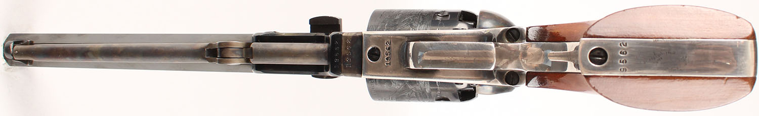 Colt, 1851 Navy Replica, CAL: 36, MFG: 1970's, SN: 19562, Single Action Percussion Revolver, 7 1/2'' octagon barrel. The wood grips are excellent. There are contusions, dings to the high gloss finish. The metal blue finish on the barrel & cylinder rate 95%+, with minor loss on the top of the barrel & edge wear at the muzzle. The case-hardened frame, hammer, & ram rod all retain vivid case-colors. Silver trigger guard & backstrap are excellent. Bore is excellent. Bead front sight. Colt's Manufacturing Company made a limited edition series from 1971 to 1976. These Colt percussion revolvers were reintroduced in 1971 (1851 Navy) & 1974 (3rd Model Dragoon). Both models were discontinued in late 1976. Blackpowder, No FFL Req. - Value: 300 to 600