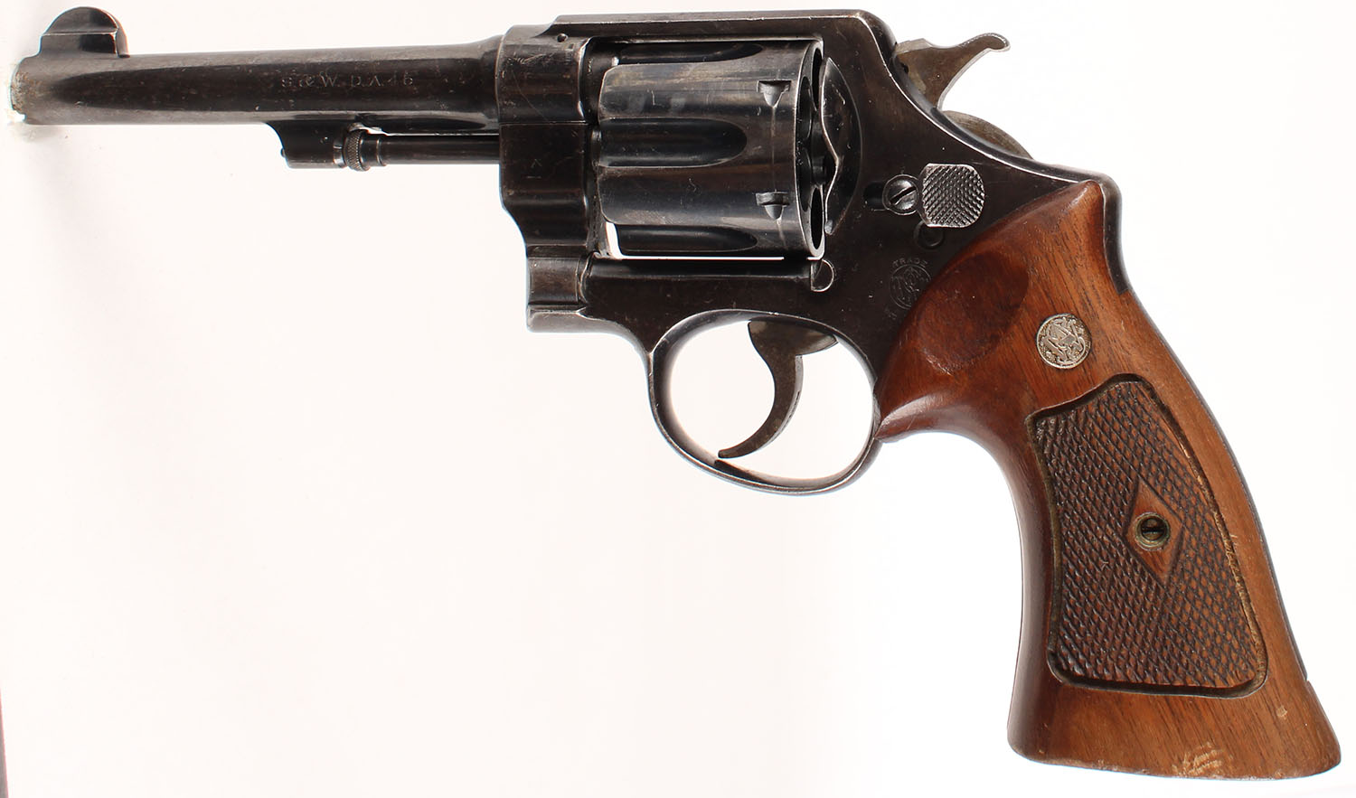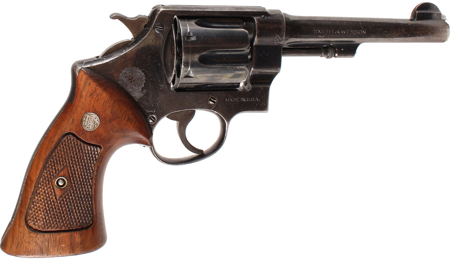 Smith & Wesson, Model 1917 Brazilian Contract (1st Contract), CAL: 45 ACP, MFG: 1937, SN: 198768, Double Action Revolver, 5 1/2'' barrel. The right side of the frame carries the Brazilian crest & bears the date ''1937''. The S&W logo medallion checkered wood grips are excellent. There are contusions, light scrapes & dings. These are replacement grips. The original grips that came on this pistol were smooth. The metal blue finish rates 70% overall, with consistent wear & a thin brown patina. Bore is excellent, with intermittent roughness. Notch & blade sights. 25,000 Model 1917's were made for the Brazilian Government. This example was apart of the first shipment in 1938, which was a majority of all the pistols sent. FFL or C&R Req. - Value: 300 to 500