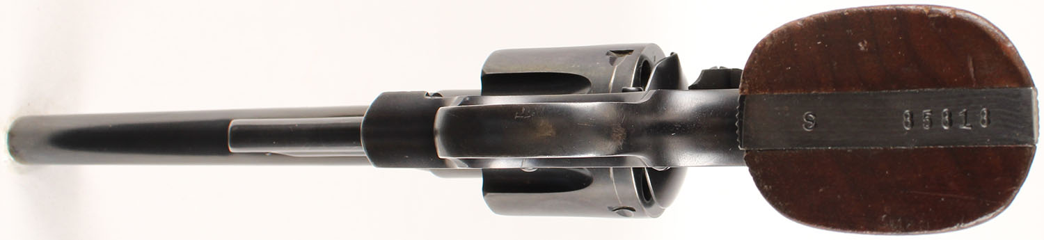 Smith & Wesson, .38/44 Outdoorsman Model of 1950 ''Pre-Model 23'', CAL: 38 S&W SPL, MFG: 1951-52, SN: S85818, Double Action Revolver, 6 1/2'' barrel. All matching SN. The Magna style diamond checkered wood grips are very good. There are nicks, scrapes & dings to the original finish. The metal blue finish rates 90% overall. Bore is excellent. Adjustable rear sight & elevated blade front sight. 6,039 were manufactured from 1950-57. FFL or C&R Req. - Value: 800 to 1600