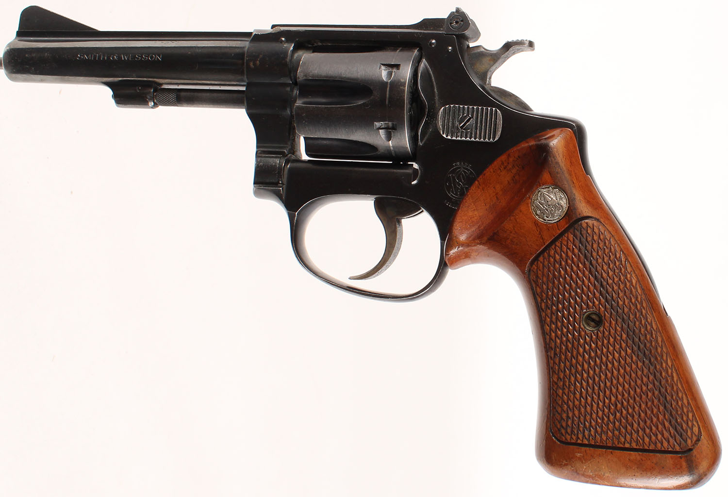Smith & Wesson, Model of 1953 .22/32 Kit Gun ''Pre Model 34'', CAL: 22LR, MFG'' 1953-57, SN: 10678, Double Action Revolver, 4'' barrel. The S&W logo medallion checkered wood grips are excellent. There are handling marks & light wear to the finish. The metal blue finish rates 85% overall. Bore is excellent, with areas of visible roughness. Adjustable rear sight & serrated blade front sight. This revolver was continued as the Model 34 in 1957. FFL or C&R Req. - Value: 500 to 1000