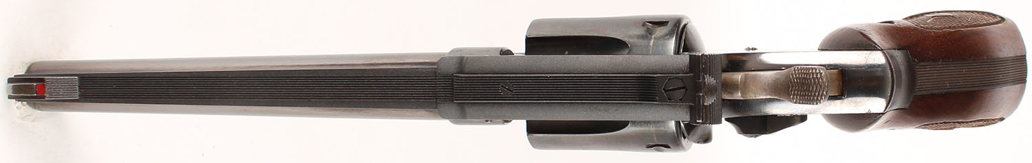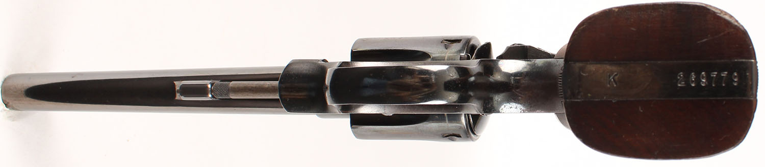 Smith & Wesson, K-22 Masterpiece Postwar 3rd Model ''Pre-Model 17'', CAL: 22LR, MFG: 1956, SN: K 269779, Double Action Revolver, 6'' barrel. The S&W logo medallion checkered wood grips are excellent. There are nicks & dings to the finish. The metal blue finish rates 85% overall, with consistent light speckling & spotting. There is light pitting on the cylinder, worn to metal gray & toned to a brown patina. The case-hardened trigger & hammer retain visible case colors. Bore is excellent. Adjustable rear sight & elevated serrated blade front sight. FFL or C&R Req. - Value: 500 to 800