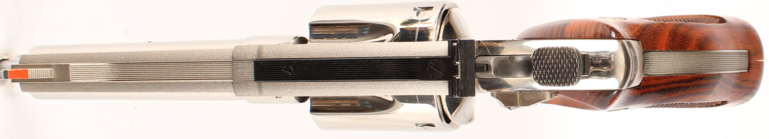 CASED, Smith & Wesson, Model 29-2 3 Screw, CAL: 44 MAG, MFG: 1980, SN: N791874, Double Action Revolver, 4'' barrel. The S&W logo medallion checkered wood grips are excellent. The original nickel finish is excellent, with visible brush lines, consistent with nickel finishes. Bore is excellent. Adjustable rear sight & serrated blade front sight with orange insert. Comes in wood presentation case, with tool & cleaning components. FFL Req. - Value: 1500 to 2500