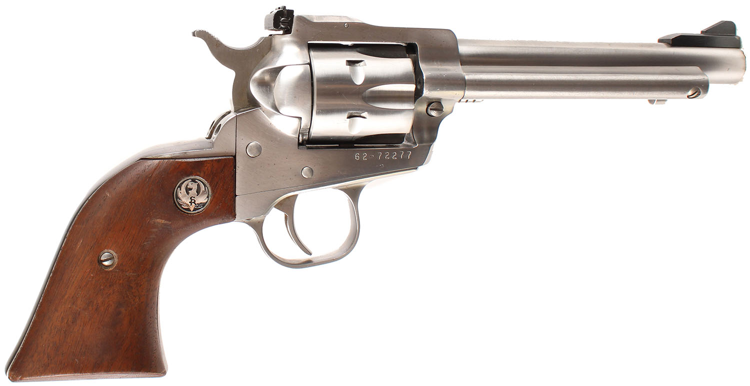 Ruger, New Model Single Six, CAL: 22 LR, MFG: 1974-75, SN: 62-72277, Single Action Revolver, 5 1/2'' barrel. The Ruger logo medallion wood grips are excellent. There are handling marks, scrapes & dings. The stainless steel finish is excellent, with light scuffs, & a few small areas of spotting. Bore is excellent. Adjustable rear sight & block elevated blade front sight. FFL Req. - Value: 400 to 700