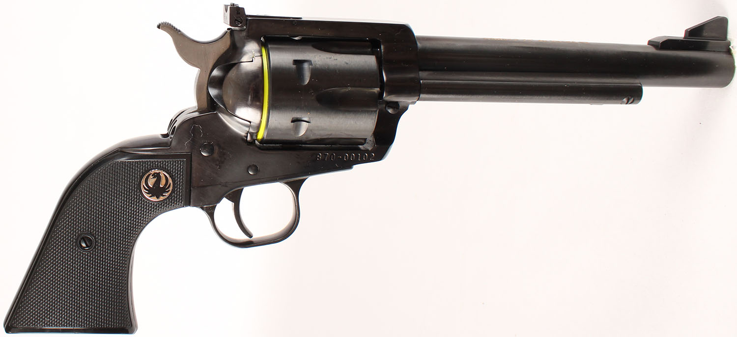 NEW, BOXED Ruger, New Model Blackhawk, 50 Years of .44 Magnum Edition, CAL: .44 MAGNUM, MFG: 2006, SN: 870-00102, Single Action Revolver. The factory Ruger logo medallion & checkered grips are excellent. The metal blue finish rates 99%+ overall. The top of the barrel is marked in two lines ''50 Years of .44 Magnum 1956-2006''. Bore is minty. Factory adjustable rear sight & elevated serrated blade front sight. Comes in original red hard case, with related paperwork, test fire cartridge, lock & original packaging. NIB. NOS. FFL Req. - Value: 800 to 1200