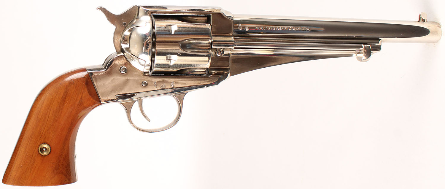 BOXED, Navy Arms, Remington Model 1875 Army Replica, CAL: 44-40, MFG: Modern, SN: 04450, Single Action Revolver, 7 1/2'' barrel. The wood grips are excellent. There are a couple minor handling marks. The nickel finish is excellent, there are visible striations & small areas of oxidization or dull areas, but no loss. Bore is excellent. Groove & post sights. Comes in original wood grain SN matching box. Box is very good, with light corner/edge wear & one split corner. FFL Req. - Value: 300 to 600